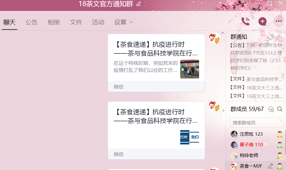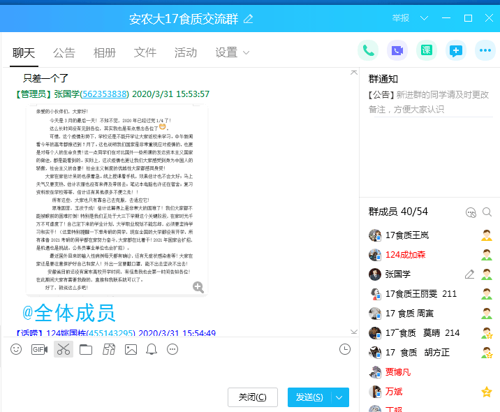书信微聊,尽显关怀。疫情期间,即使无法面对面沟通,也阻挡不了辅导员对自己学生的关怀。通过班级QQ群为大家写一封书信;通过视频和微聊一对一和学生互动,有针对性地加强同学们传染病防控知识的宣传教育,加强爱国主义教育,加深对中国特色社会主义制度的优势更深刻的理解。