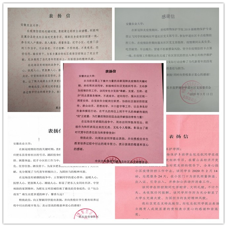 本网讯 5月20日,学院收到一封来自肥东县青春社区的特殊书信,“你不计报酬、不图待遇、不惧艰危、任劳任怨、踏实肯干,为家乡肥东的社区疫情防控做出了突出贡献。”信中对2019级动植物检疫专业的王智颖同学提出了高度表扬。这也是自3月以来,学院收到的第五封表扬信。