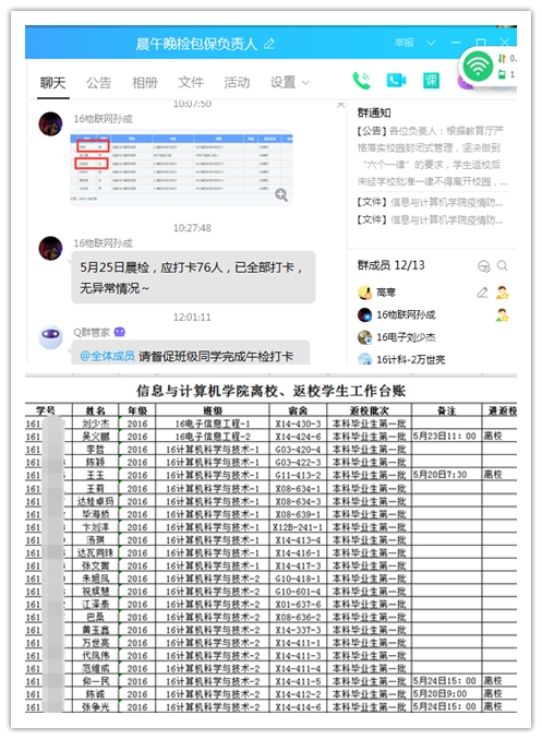 梳理健康总台账,精准核实排查。坚持每日对学生疫情防控信息日报情况进行精准摸排,建立返校学生QQ群,“一对一”“点对点”“人盯人”执行宿舍包保责任制,提醒学生按时完成晨、午、晚三次体温自测打卡填报,切实掌握每位在校学生的身体状况、流动去向及生活动态,及时准确向学院、学校上报信息,积极落实“日报告、零报告”制度,做到不漏报、错报、迟报。同时,制定在校学生流动工作台账,实时更新人数,有效形成严密的责任闭环、管控闭环、工作闭环。
