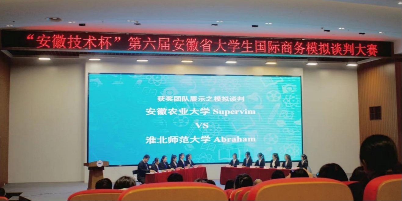 “安徽技术杯”安徽省大学生国际商务模拟谈判大赛是省内国际经济与贸易学科领域内影响力较大的传统赛事。比赛由谈判案例分析和模拟谈判构成,旨在提升国际经济与贸易专业人才的专业应用技能,推动高水平国贸应用型人才的培养。学院经济系张聪、胡沅洪老师指导的“supervim代表队”和武海峰、王蕙老师指导的“说得非常队”代表队,在备赛过程中注重学生谈判技巧训练和谈判策略创新训练。在比赛中,团队成员团结协作、合理分工、冷静分析,经过激烈角逐, 在全省六十多支代表队中脱颖而出,取得好成绩。值得一提的是,“supervim队”获得了全省最高分,并且受组委会邀请在颁奖典礼上进行模拟谈判表演。