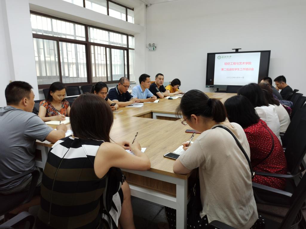 本网讯 6月11日下午,轻纺工程与艺术学院在学院3A09会议室召开第二批返校学生工作培训会,全体专兼职辅导员参加培训,会议由学院党委副书记、副院长吕剑秋主持。