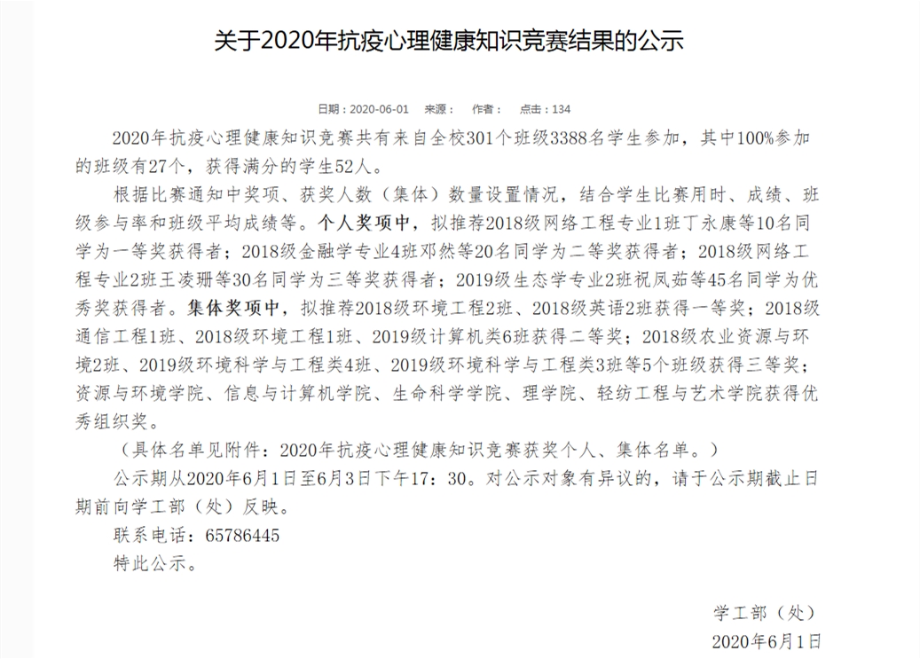 生命科学学院认真组织开展2020抗疫心理健康知识竞赛。学院积极组织动员,在各班级心理委员及全院学生的齐心努力下,基本做到一二年级全员参与,最终学院荣获优秀组织奖称号;个人奖项中,2018级生物制药专业宋林林同学获得三等奖,2018级生物类创新实验班等6名同学获得优秀奖。通过赛前学习专业心理知识,同学们对心理健康有了科学化的认知,为日后积极处理心理困扰提供了知识保障。