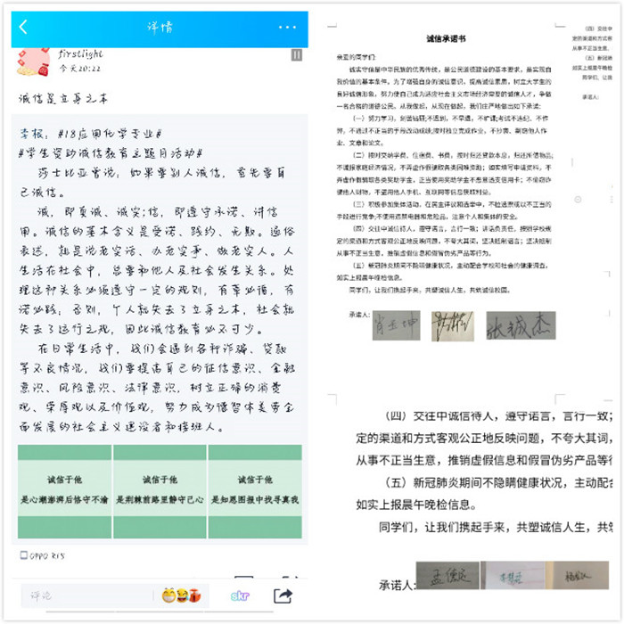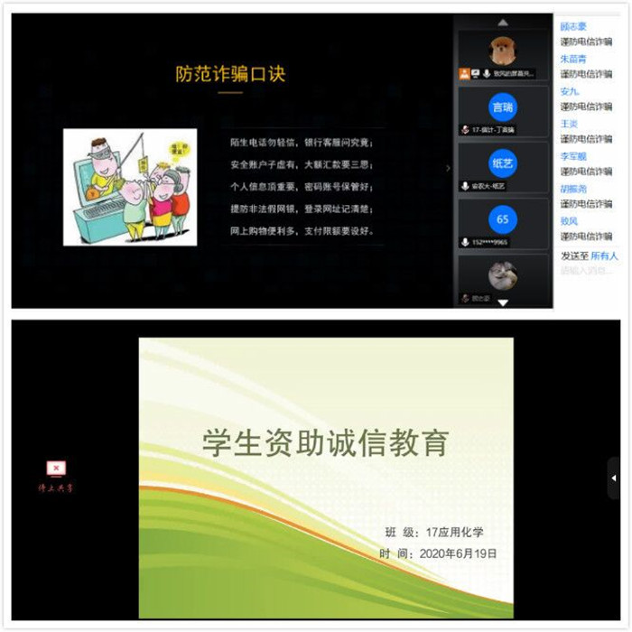 各班级充分利用新媒体优势,在班级QQ群、腾讯会议等平台组织召开班会。会上,各班级通过举办图片展、学习诚信和金融知识、诚信宣誓、观看防诈骗视频等,向学生们进一步普及了诚信及金融知识,宣传国家助学贷款及其他资助政策等。同时也引导了学生珍爱信用、理性消费,提高学生们的征信意识、金融意识、风险意识、法律意识,引导他们树立正确的消费观、荣辱观、价值观。在诚信教育中不断提升学生们的责任担当。(许典舟 通讯员:钟晨)