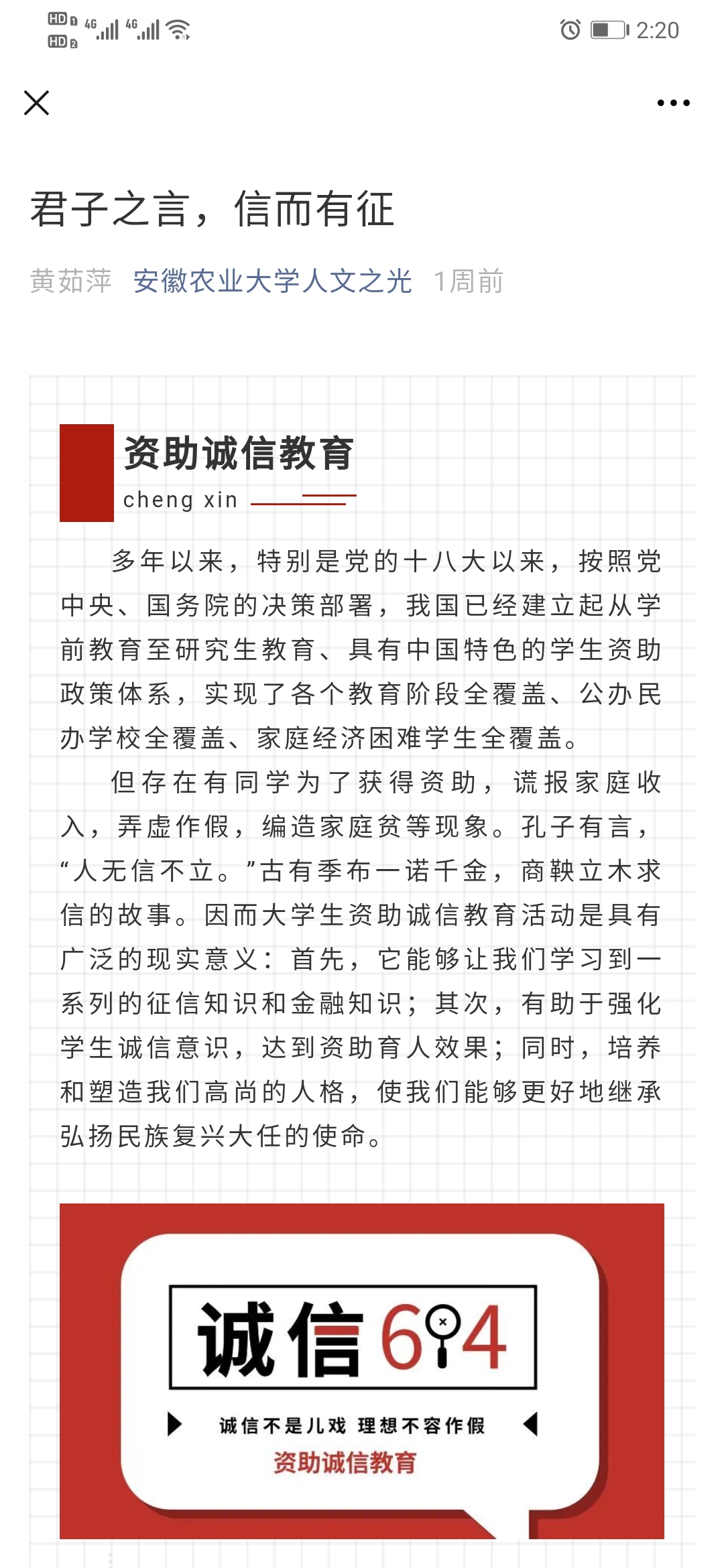 学院为了拓展学生资助诚信教育的渠道,利用新媒体“人文之光”做了一期主题为“君子之言,信而有征”的推送,向学生介绍了国家和学校的资助政策,征信知识,防诈骗知识,防不良网贷等知识,提高学生的诚信意识和防诈骗防不良网贷的能力。