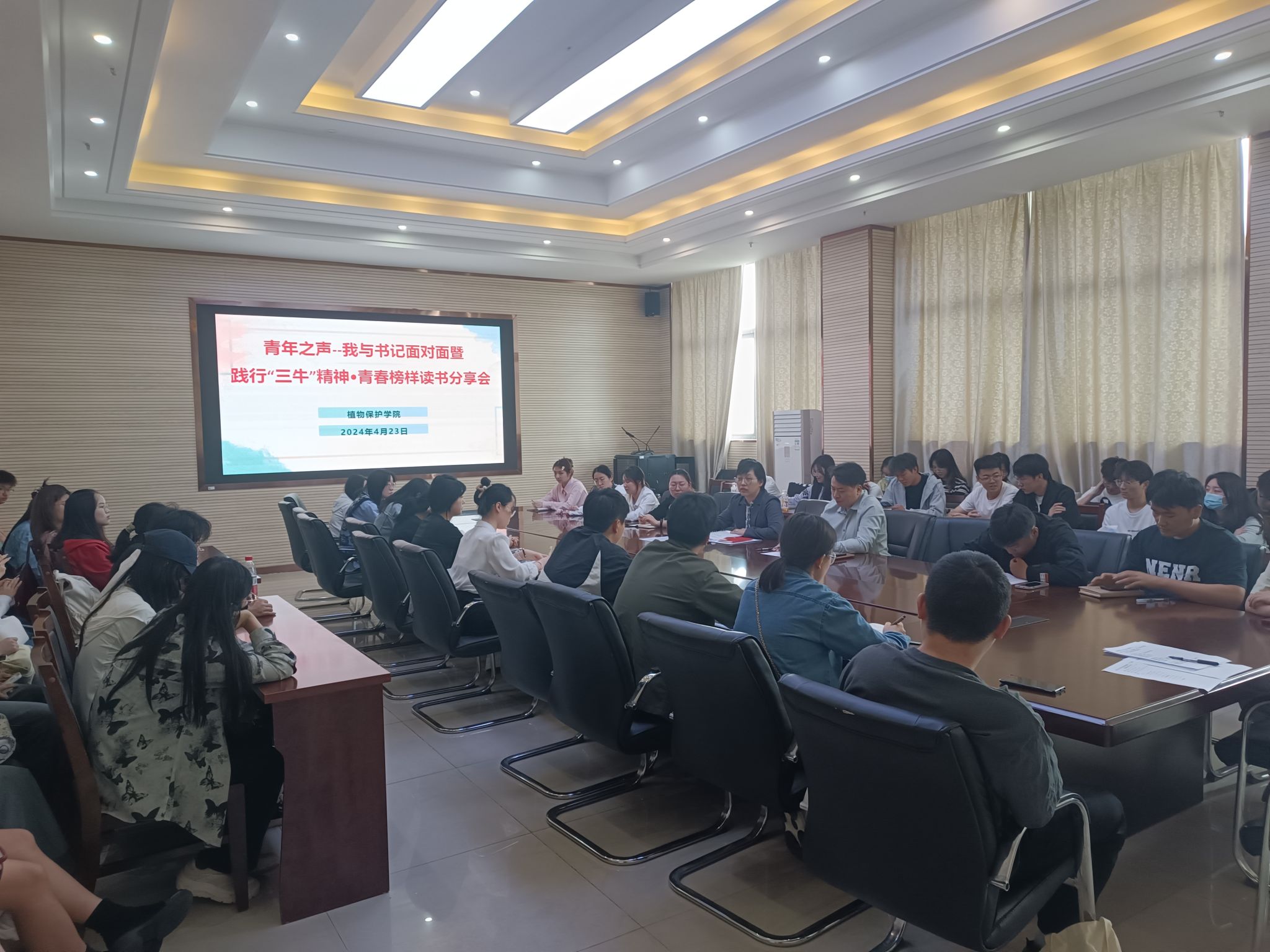 本网讯 4月23日,正值第29个“世界读书日”。当天中午,植物保护学院在中西部综合楼1213会议室召开青年之声--我与书记面对面暨践行“三牛”精神•青春榜样读书分享会。学院党委书记刘柳出席会议,2023年选树的院级榜样人物(团体)参加会议。会议由学院党委副书记汪小强主持。