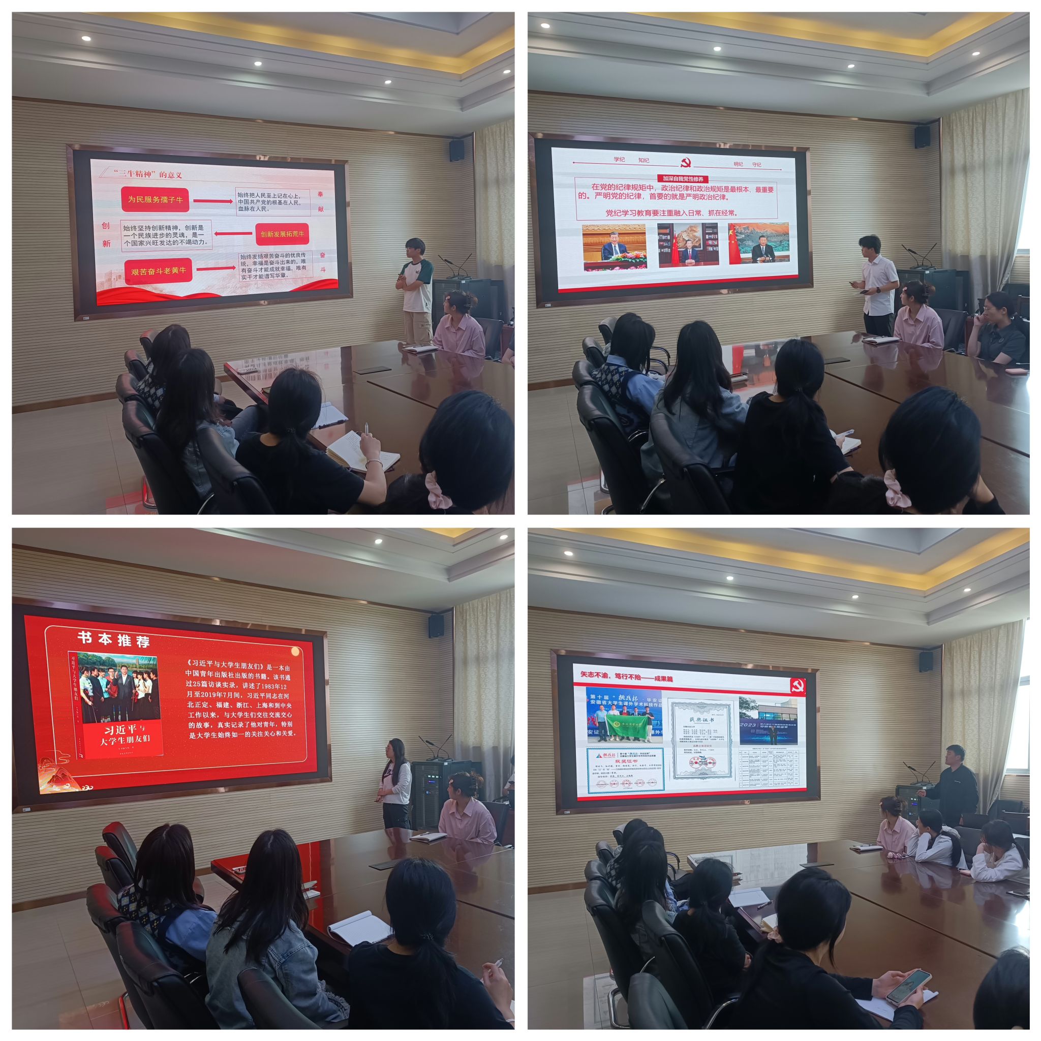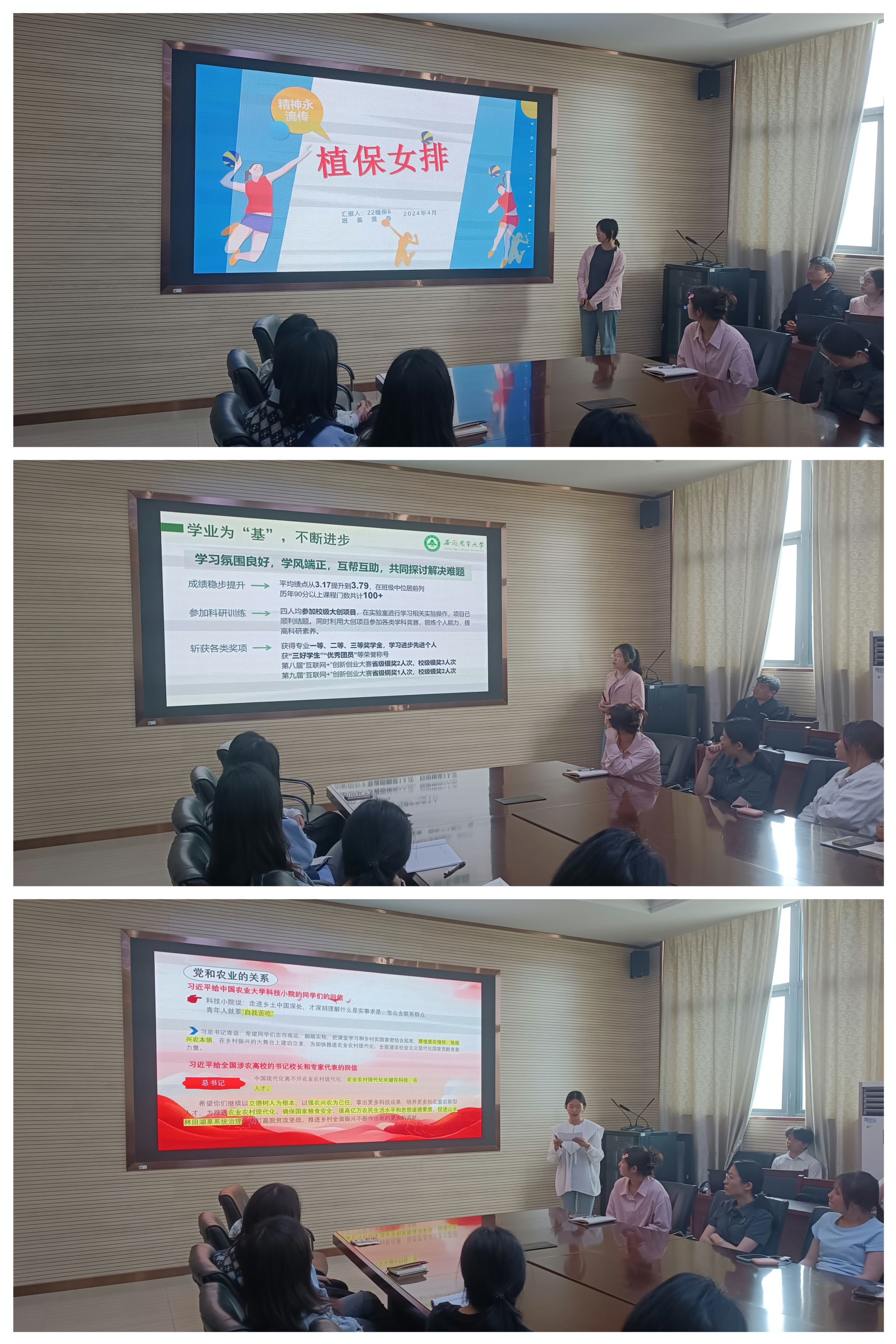 “榜样的力量是无穷的”“优秀不止一种模样……”会上,习言习语分享篇章中,榜样人物代表分别汇报了世界读书日、“三牛”精神内涵、青年人自找苦吃和党纪学习教育的相关内容。青春榜样引领环节中,代表分享了“植保女排”精神、星级示范宿舍事迹以及“我与安农”成长的6年。现场气氛温馨热烈,收获了掌声与感动,师生荣誉感、获得感溢于言表。会上,同学们还就近期的学习、生活等方面的问题作了沟通和交流。(文图/张小龙 编辑/丁放 预审/汪小强 审核/刘柳)