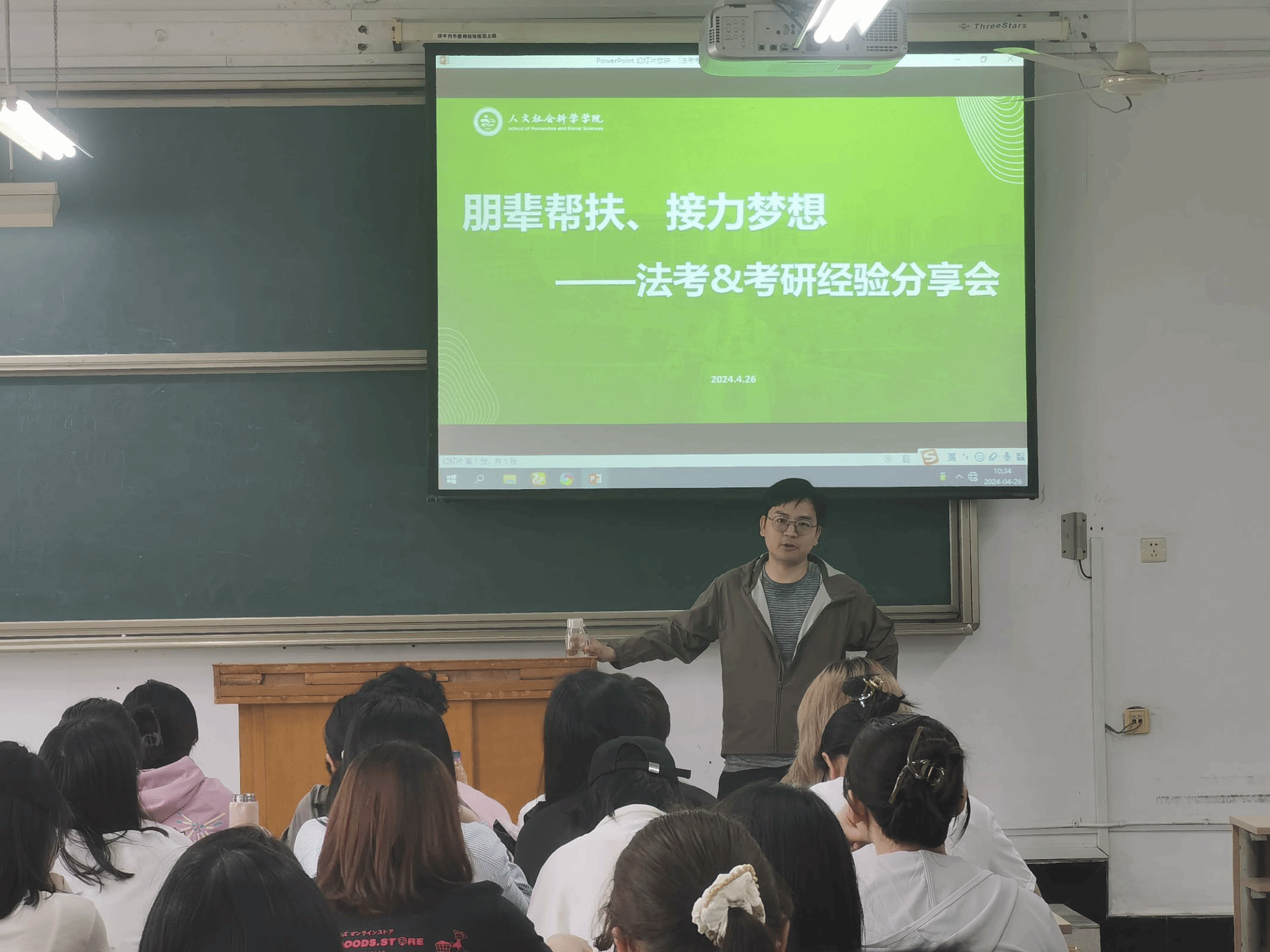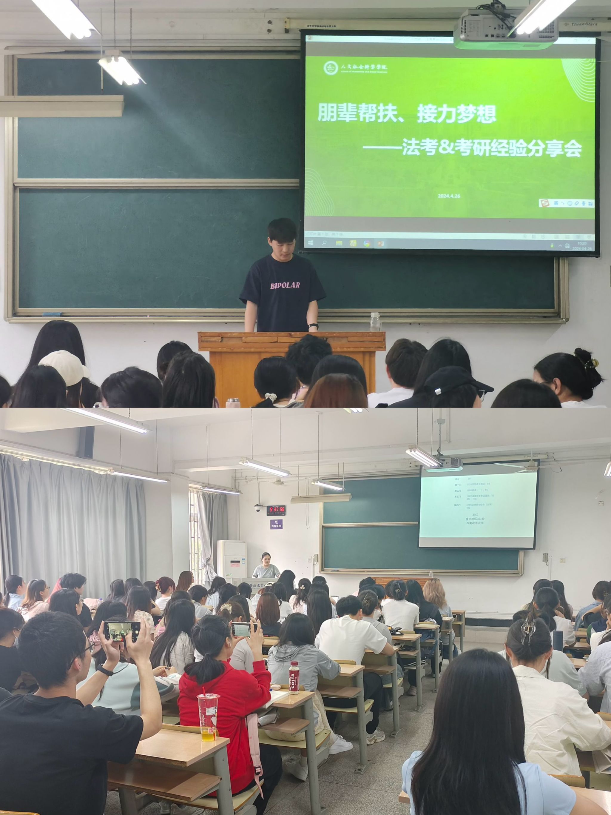 本网讯 为帮助法学学生了解法考和考研的相关政策、备考技巧以及未来职业规划,4月26日,人文社会科学学院在博学楼423举办了一场法考考研分享会,人文社会科学学院法学学生参加。