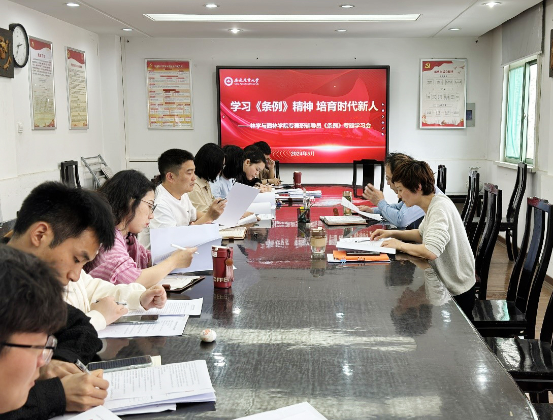 本网讯 5月9日下午,林学与园林学院在二楼会议室组织党纪学习教育专题会,全体专兼职辅导员集中学习新修订的《中国共产党纪律处分条例》,学院党委书记江正君主持会议。