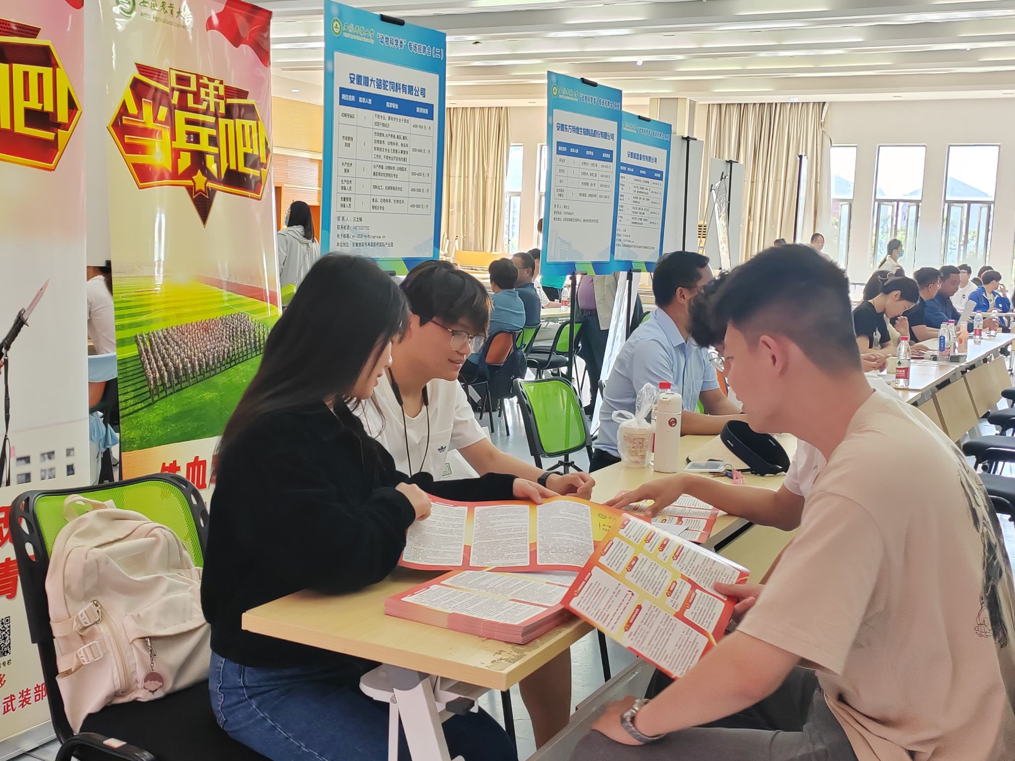 结合招聘,精准动员。临近毕业,为持续做好针对性宣传,学院结合专场招聘会,设置了征兵入伍咨询台,通过现场发放宣传资料、宣讲入伍政策、登记报名等方式,再次精准动员。
