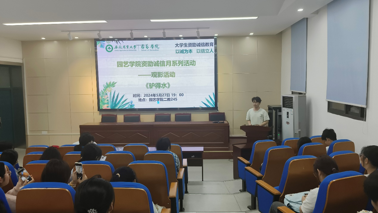 本网讯 为进一步提高我院学生资助工作水平,强化资助育人效果,弘扬“以诚为本,以信立身”的精神, 2024年5月27日晚,园艺学院在二教245开展资助诚信月观影活动,学院师生热情参与。