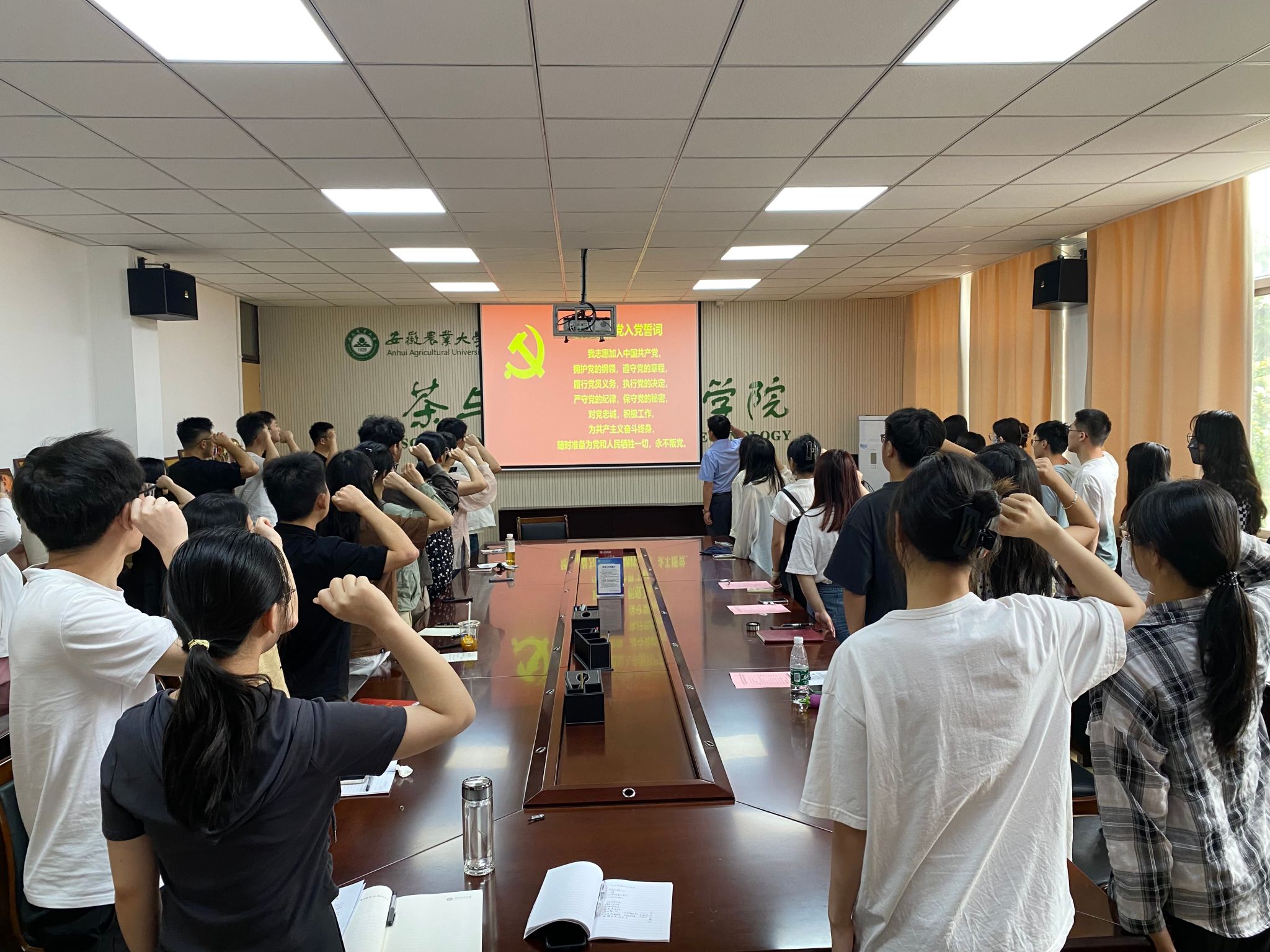 随后,沈周高带领毕业生党员们举起右拳,庄严宣誓:“我志愿加入中国共产党,拥护党的纲领,遵守党的章程……随时准备为党和人民牺牲一切,永不叛党。”铿锵恢弘的誓词,震撼着在场每一位党员的内心,铮铮有力的誓言,彰显着每一位党员不忘初心、矢志奋斗的坚定决心。