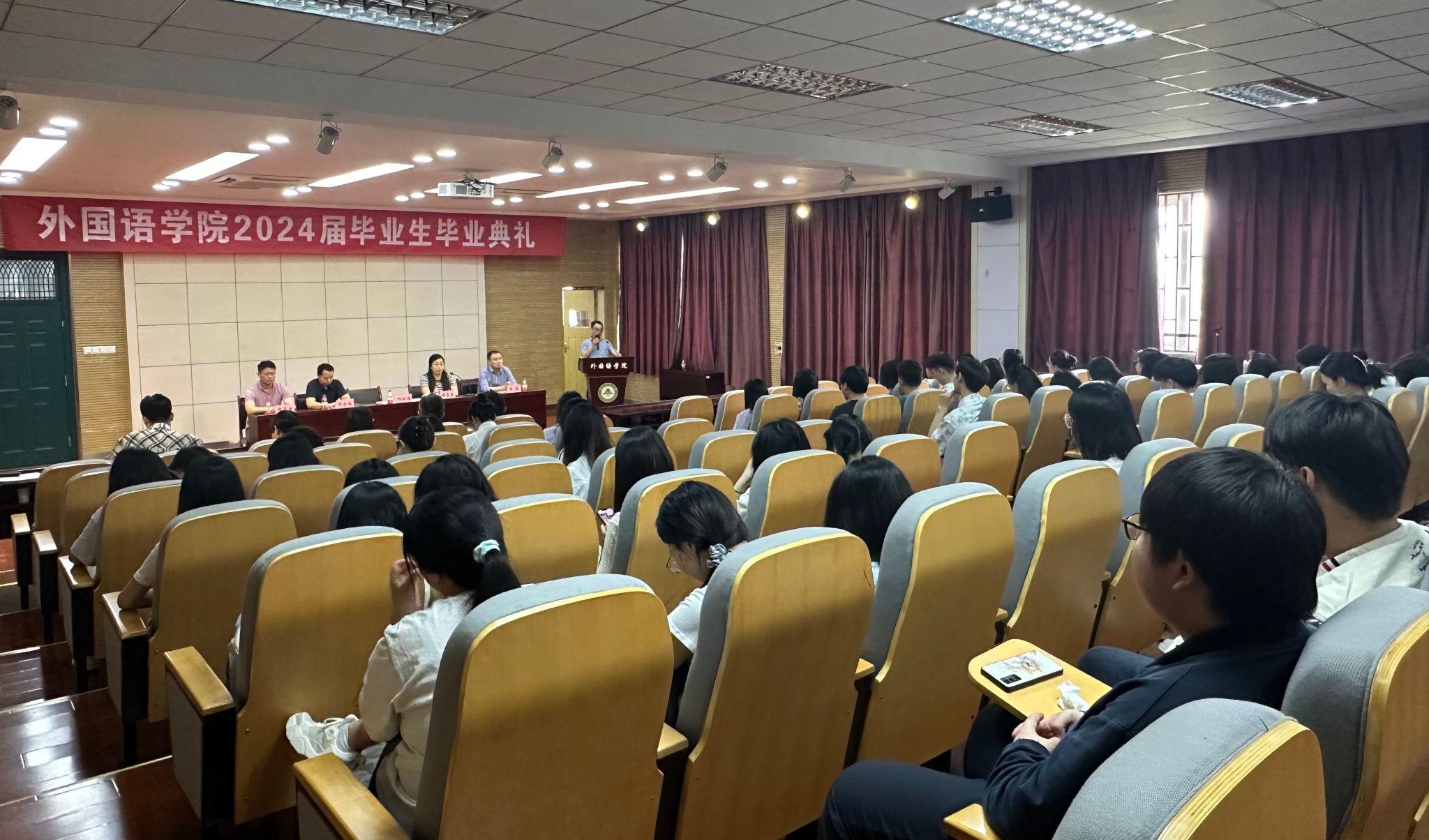 6月6日上午,外国语学院在外语楼502报告厅举行2024届毕业生毕业典礼,学院党政领导、系主任、毕业班辅导员、教师代表、家长代表、学院党政办工作人员、2024届毕业生参加了典礼,毕业典礼由学院党委副书记、纪委书记、副院长姬惠惠主持。