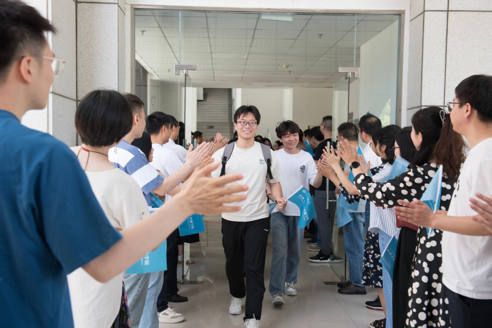 典礼暨欢送会结束时,与会全体领导、教师、辅导员移步第一报告厅出口,站至两侧,与每一位毕业生击掌告别。(图/范雅辰 文/肖红雨 编辑/邓菁菁 初审/李南飞)