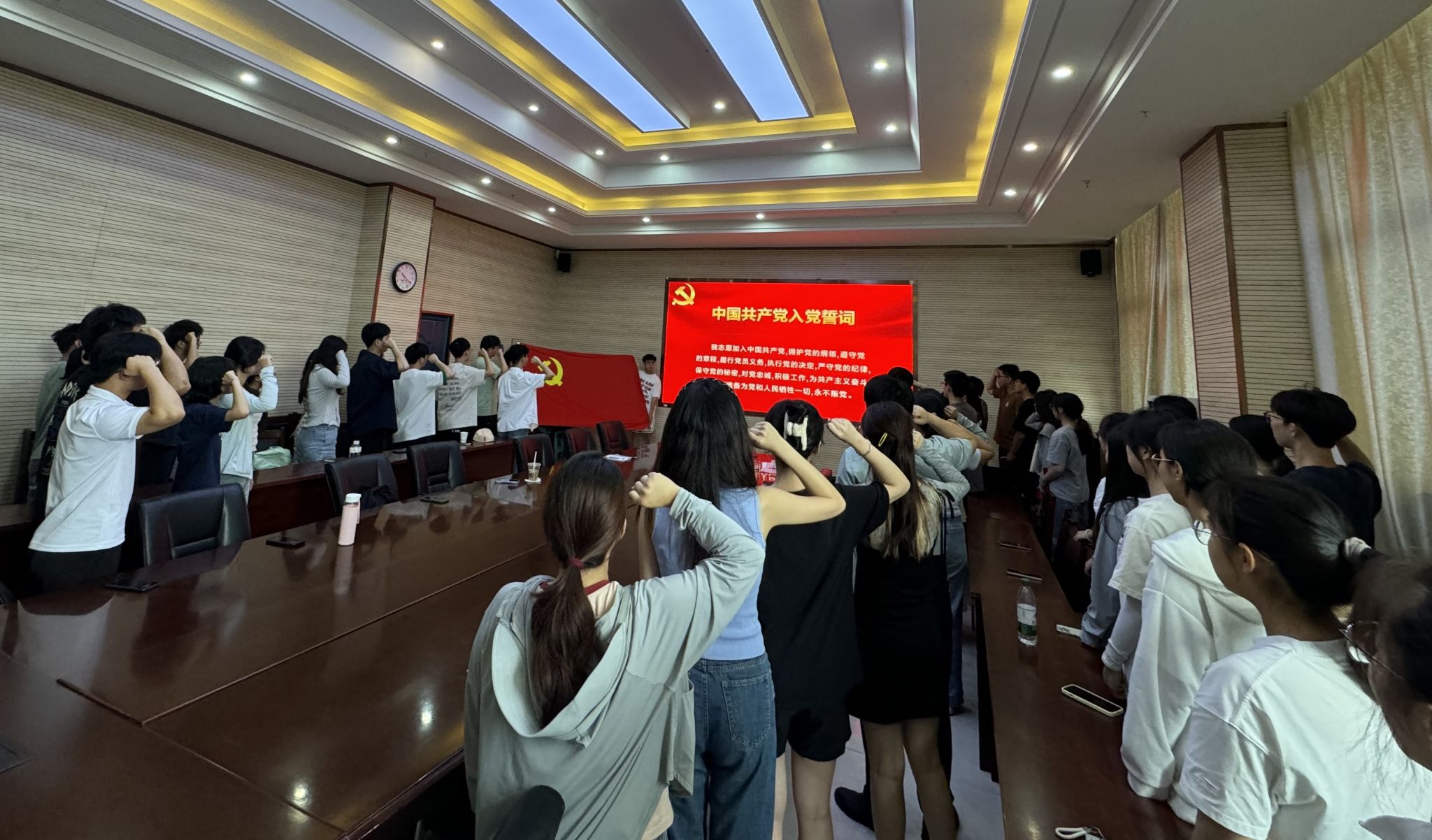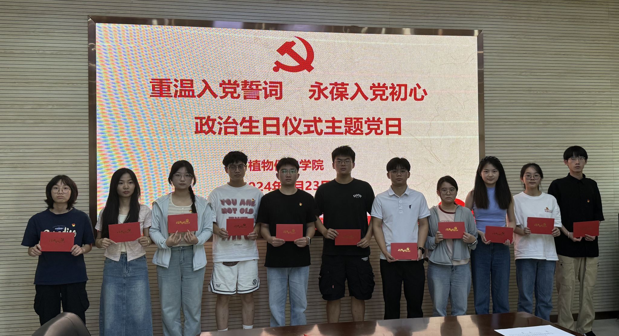 会上,11名2021级本科正式党员分享了入党初心和申请入党以来思想与行动上的转变、个人先锋模范作用发挥等情况,与会人员为他们过了集体政治生日。与会党员教师、党员同学为今年春季新发展的预备党员佩戴了党徽、赠送了党章,带领他们进行了入党宣誓。