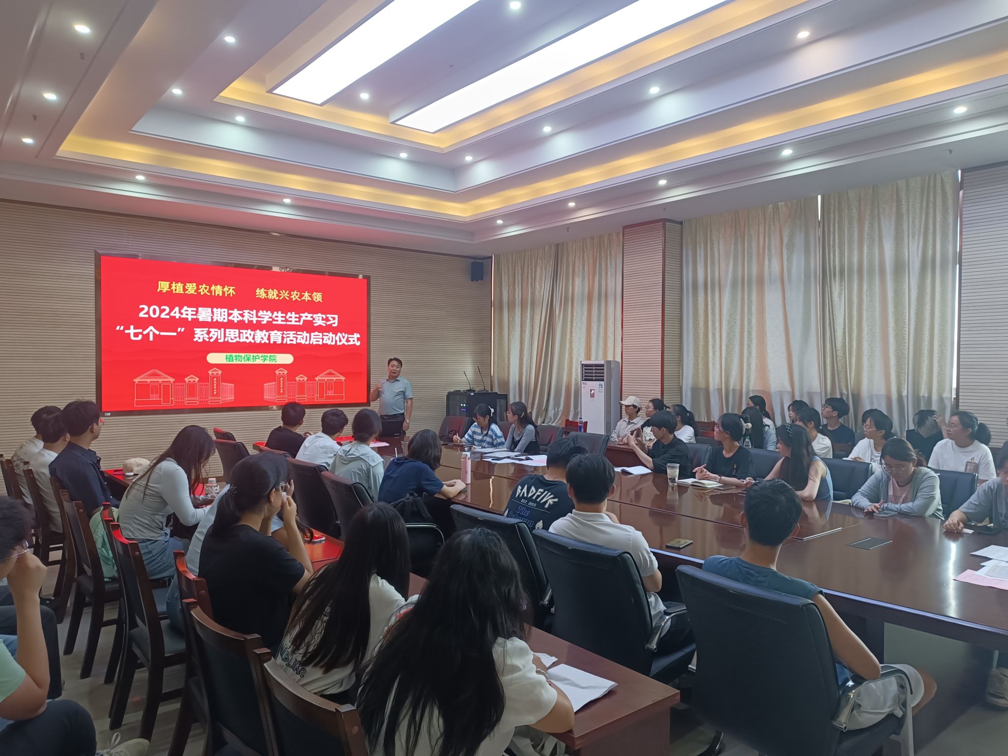 本网讯 6月23日上午,植物保护学院在中西部综合楼1213会议室召开2024年生产实习“七个一”思政系列教育活动启动仪式。学院2021级全体党员、入党积极分子和辅导员参加会议,院党委副书记汪小强主持会议。