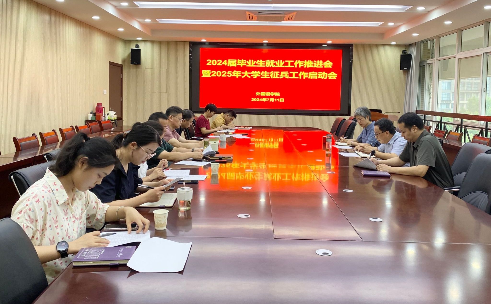 7月11日,外国语学院召开2024届毕业生就业工作推进会暨2025年大学生征兵工作启动会。学院党委书记何如海、各系(部)主任、2024届和2025届毕业班辅导员、教学秘书、就业联络员、征兵工作联络员等参加了会议。会议由副院长许宗瑞主持。