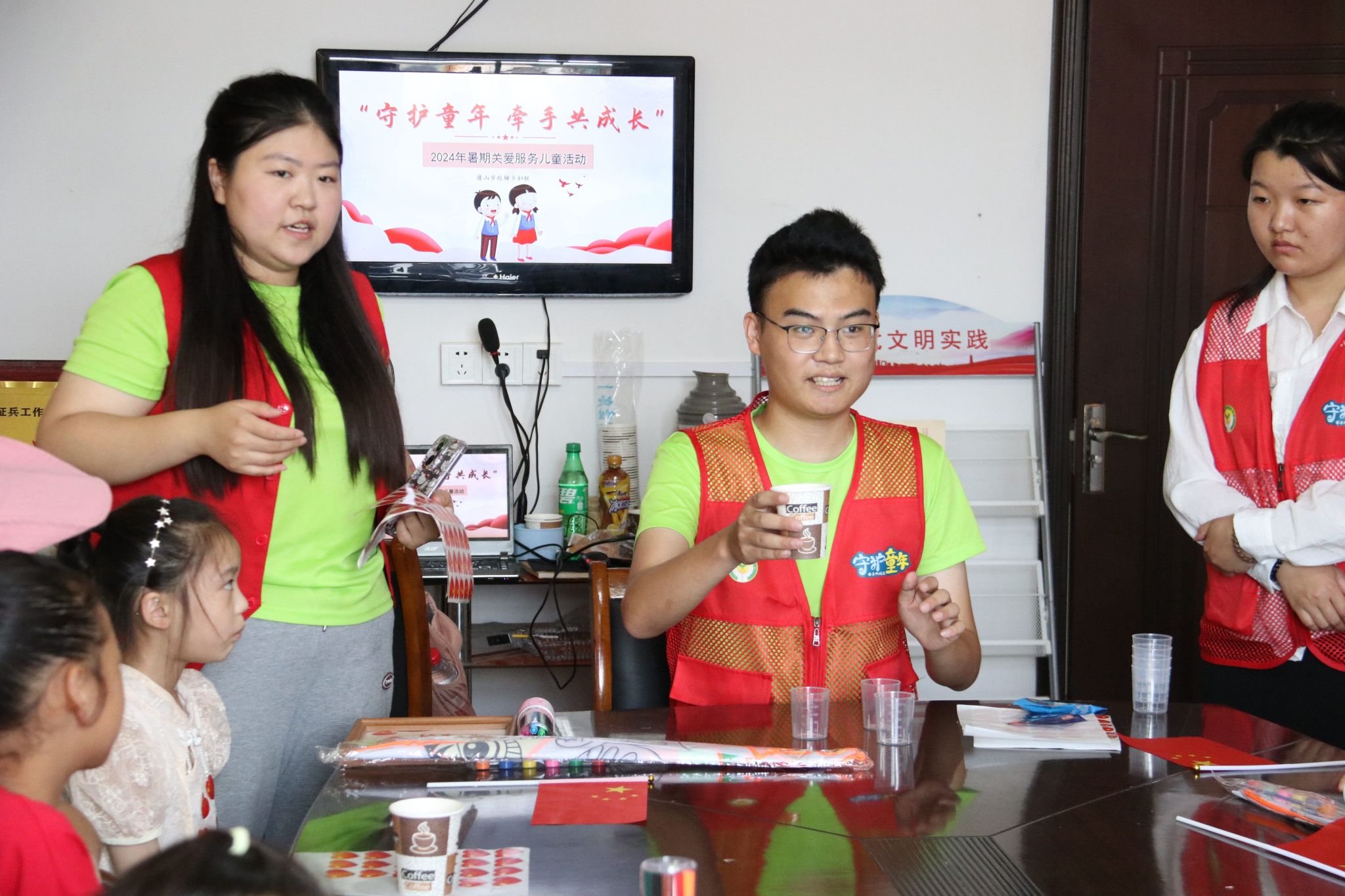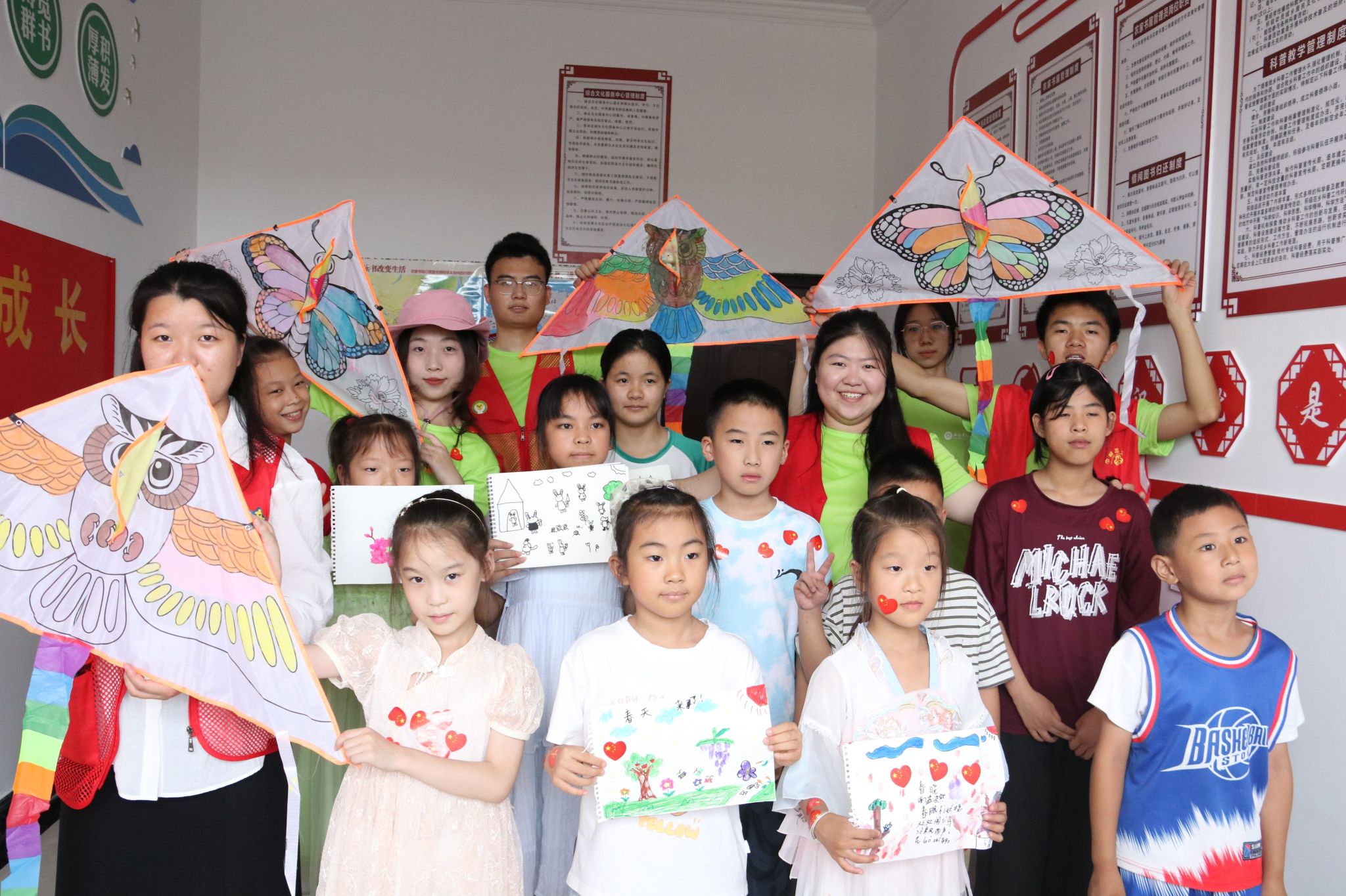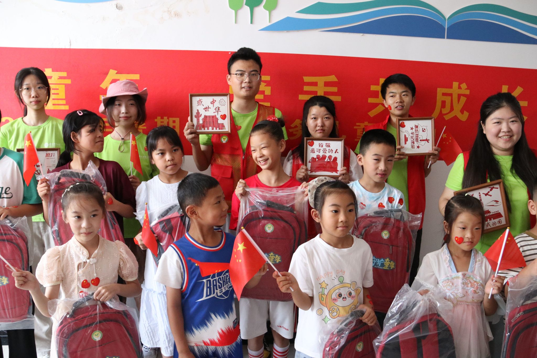 随后,队员们一对一带领小朋友们做以爱国主义为题材的非遗竹编。“姐姐,快看我做的!”稚嫩的童声在课堂中此起彼伏。大家高举自己的作品,脸上洋溢着幸福的笑容。在寓教于乐的轻松氛围中,既培养了他们的专注力,又潜移默化的培育了家国情怀。