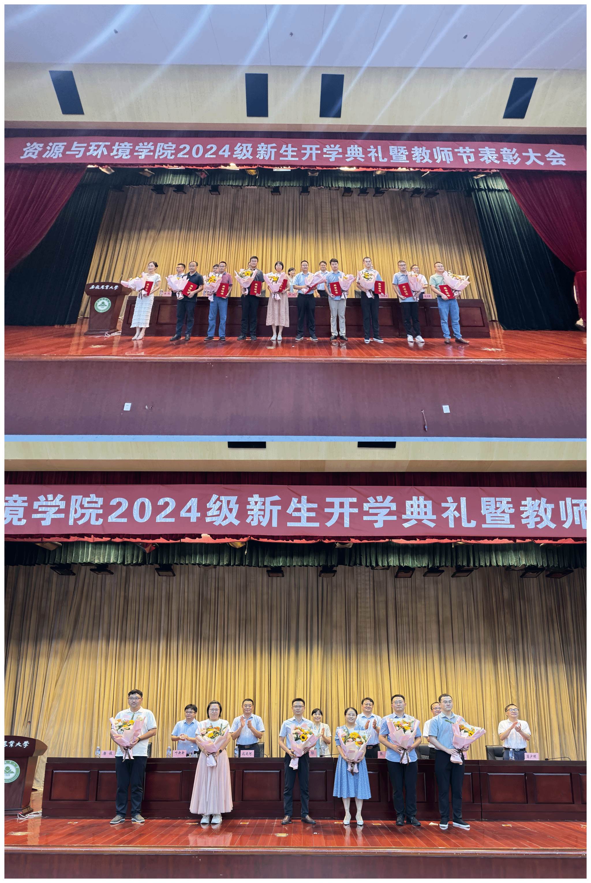 本网讯 9月2日下午,资源与环境学院2024级新生开学典礼暨教师节表彰大会在图书馆第一报告厅隆重举行。学院党政领导、系部教师、校友代表、军训教官、专兼职辅导员以及2024级全体新生共同参加典礼。