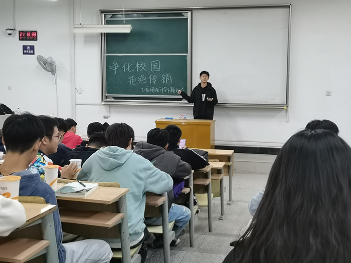 学院依托各班级、各团支部,以“净化校园·拒绝传销”为主题,组织召开一次反传销主题班会,学习反传销相关知识,引导学生自我教育、自我管理、自我服务,把抵御传销的客观要求内化为学生的自觉行动。