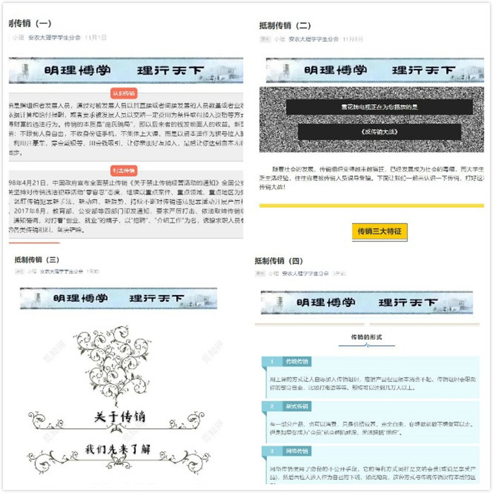 学院依托院微信公众号平台,每周推送一篇专题图片、反传销文字等宣传资料,进一步扩大了校园防范传销宣传教育活动的覆盖面,营造抵制传销的浓厚氛围。