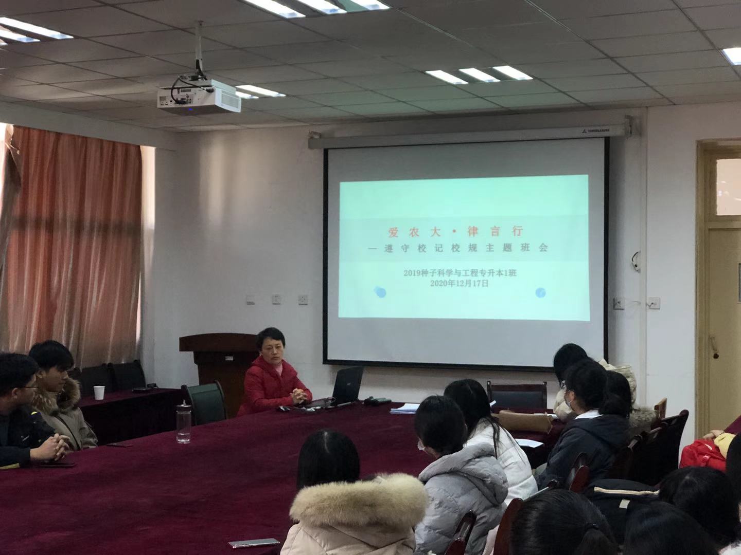 本网讯 为了进一步增强同学们法纪意识,培育法治思维,构建安全文明和谐校园,12月17日-23日,农学院本科、研究生各班级召开“爱农大·律言行”主题班会。