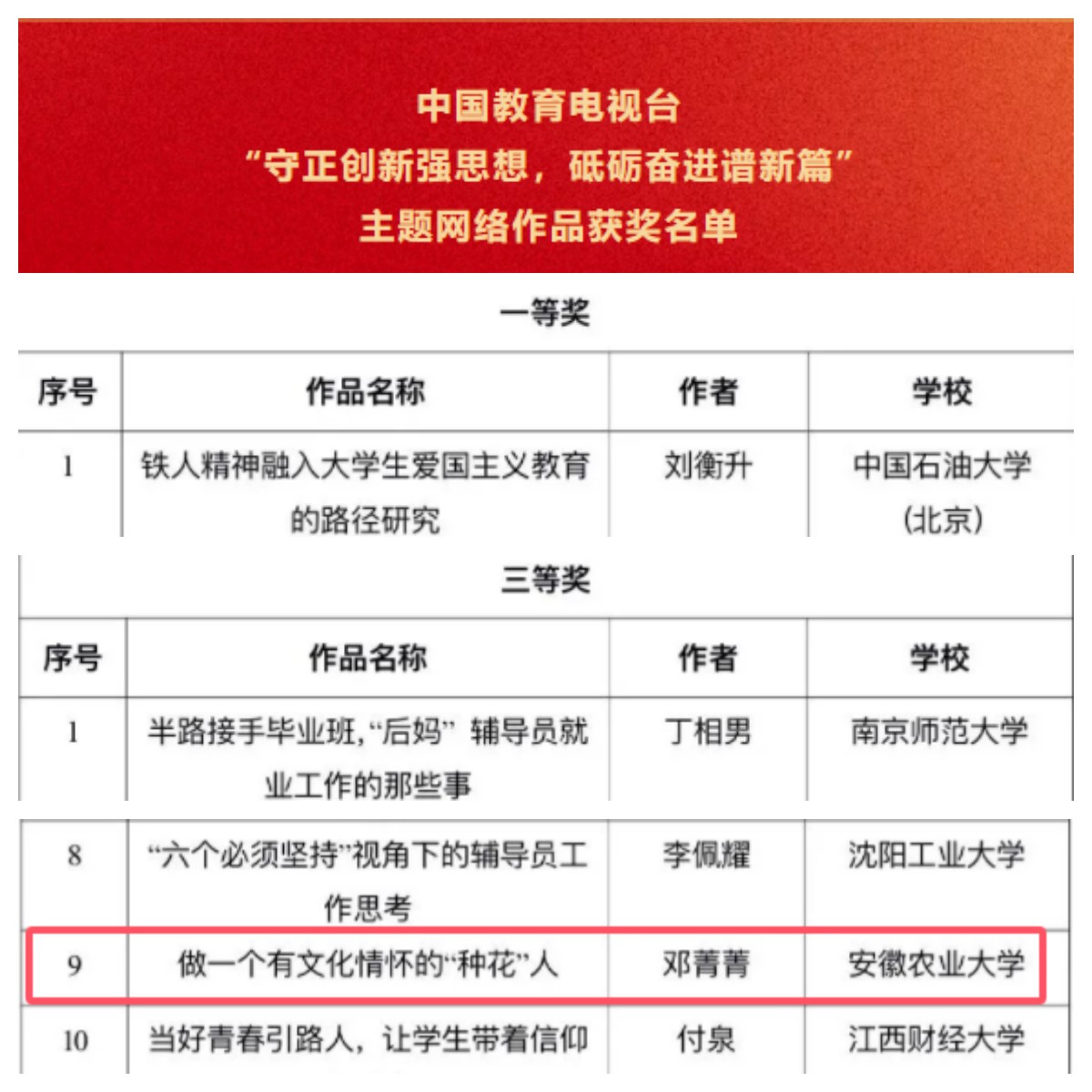 本网讯 近日,中国教育电视台“守正创新强思想 砥砺奋进谱新篇”主题网络作品遴选结果公示,网络文章类作品共评选出一等奖4项、二等奖8项,三等奖16项。信息与人工智能学院辅导员邓菁菁作品《做一个有文化情怀的“种花”人》荣获三等奖。