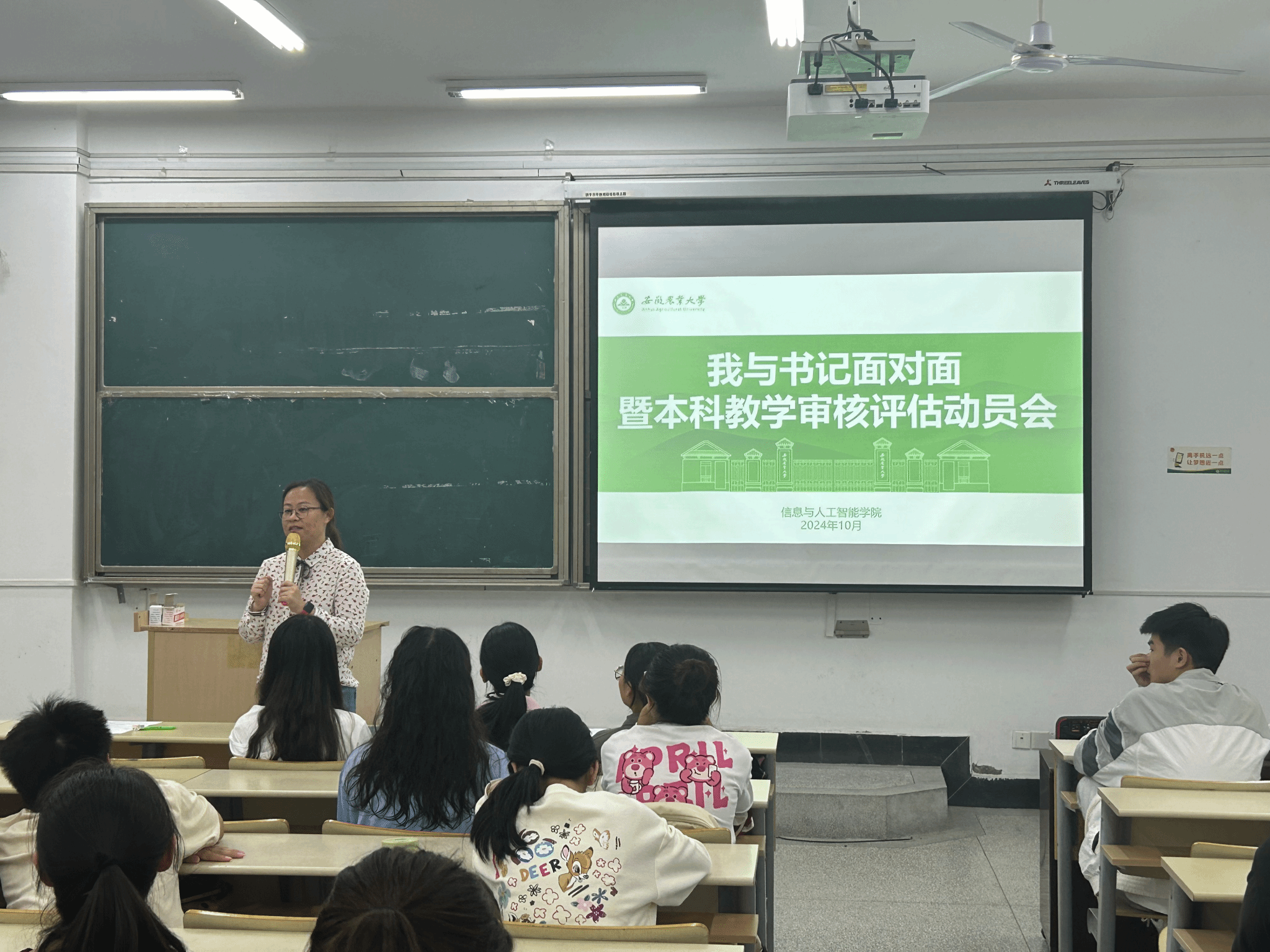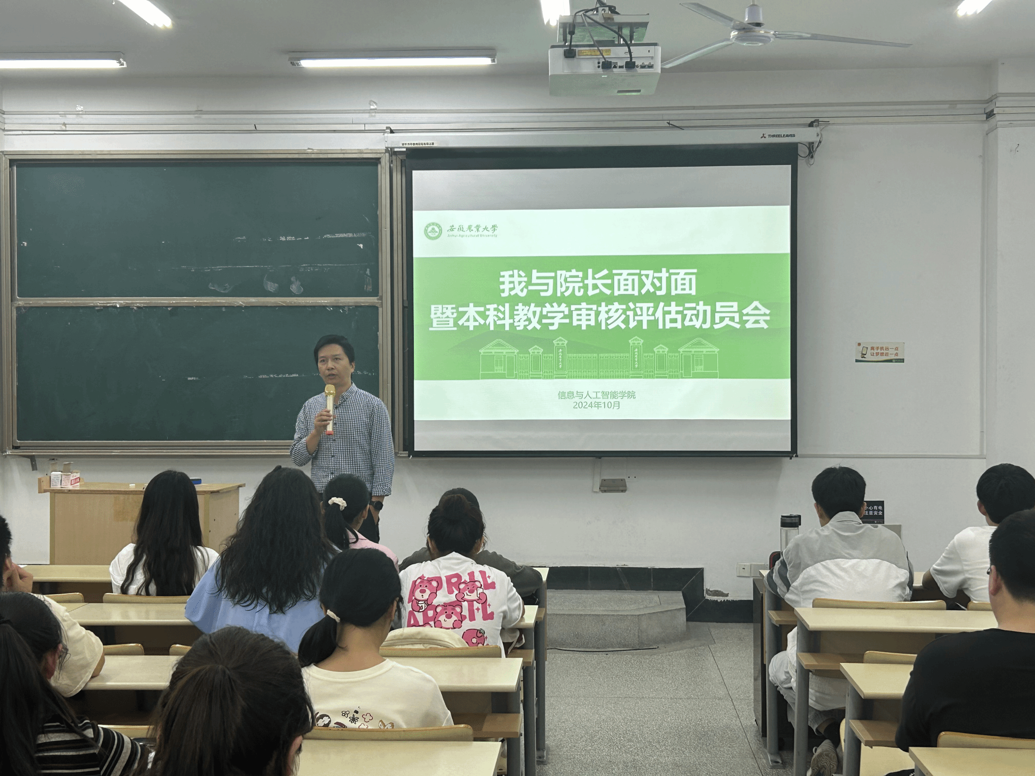 本网讯 为进一步推进本科教育教学审核评估工作,激发学生的参与热情,共同推动学院教育教学质量的持续提升,10月18日晚,信息与人工智能学院在信智楼202教室召开“我与书记、院长面对面”暨本科教育教学审核评估学生骨干动员会,学院党委副书记、纪委书记李南飞,副院长张成堂,22级、23级、24级班长、团支书以及学生分会所有成员参加会议。