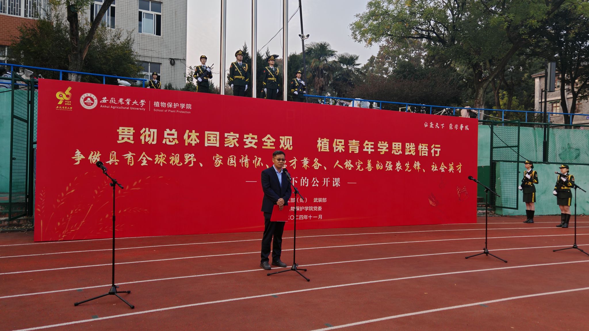 本网讯 11月4日上午,植物保护学院在校第一运动场举行了以“贯彻总体国家安全观 植保青年学思践悟行”为主题的96周年校庆主题升旗仪式暨国旗下的公开课活动。校党委学工部(处)、武装部负责同志卢伟出席活动。学院党政领导班子成员,全体专兼职辅导员、班主任,本科生、研究生代表参加活动。升旗活动由学院党委书记刘柳主持。