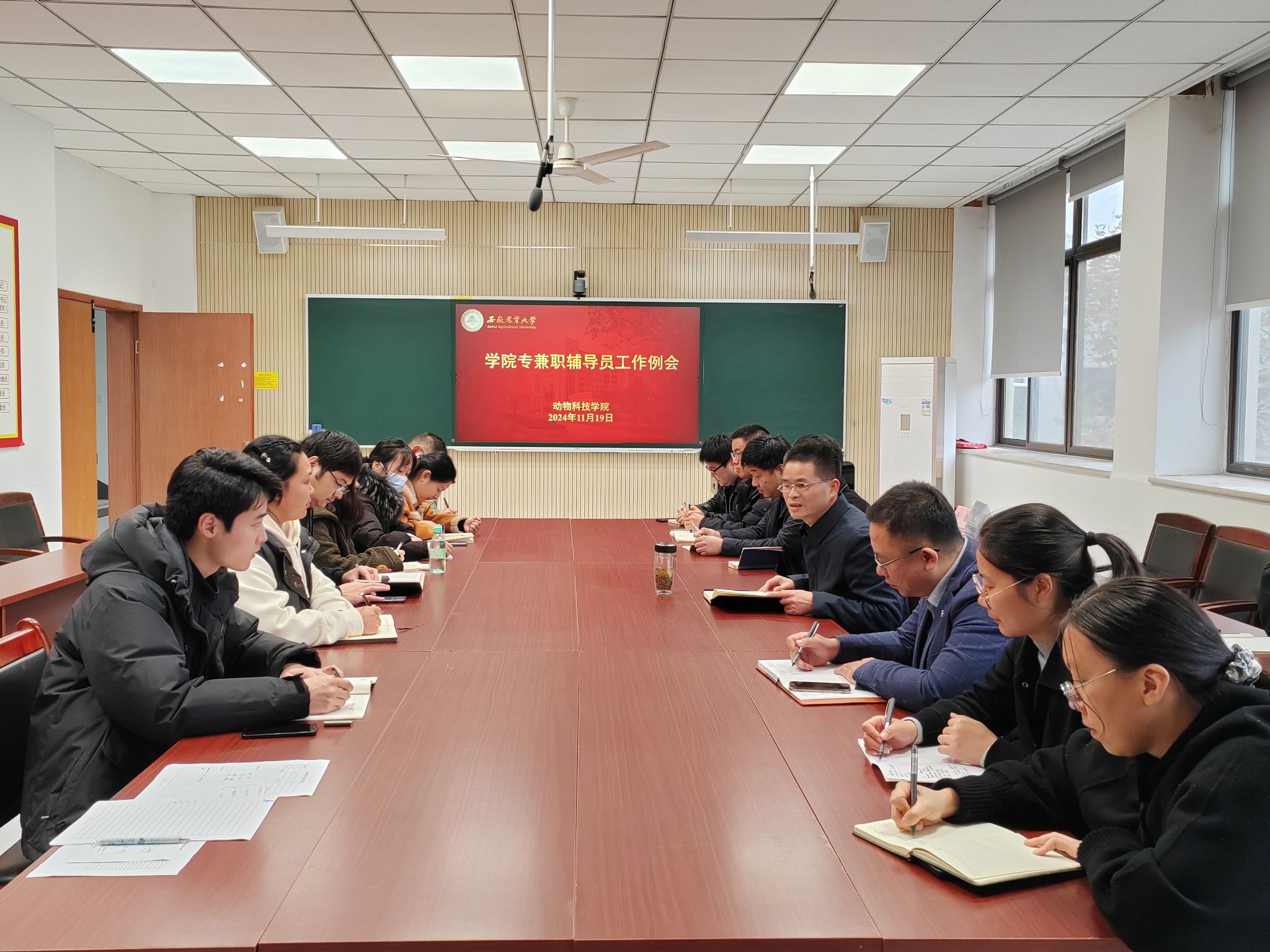 本网讯 11月19日,动物科技学院在动科楼306会议室召开专兼职辅导员工作例会。学院全体专兼职辅导员、班主任参加会议。本次会议由学院党委副书记章巍主持。