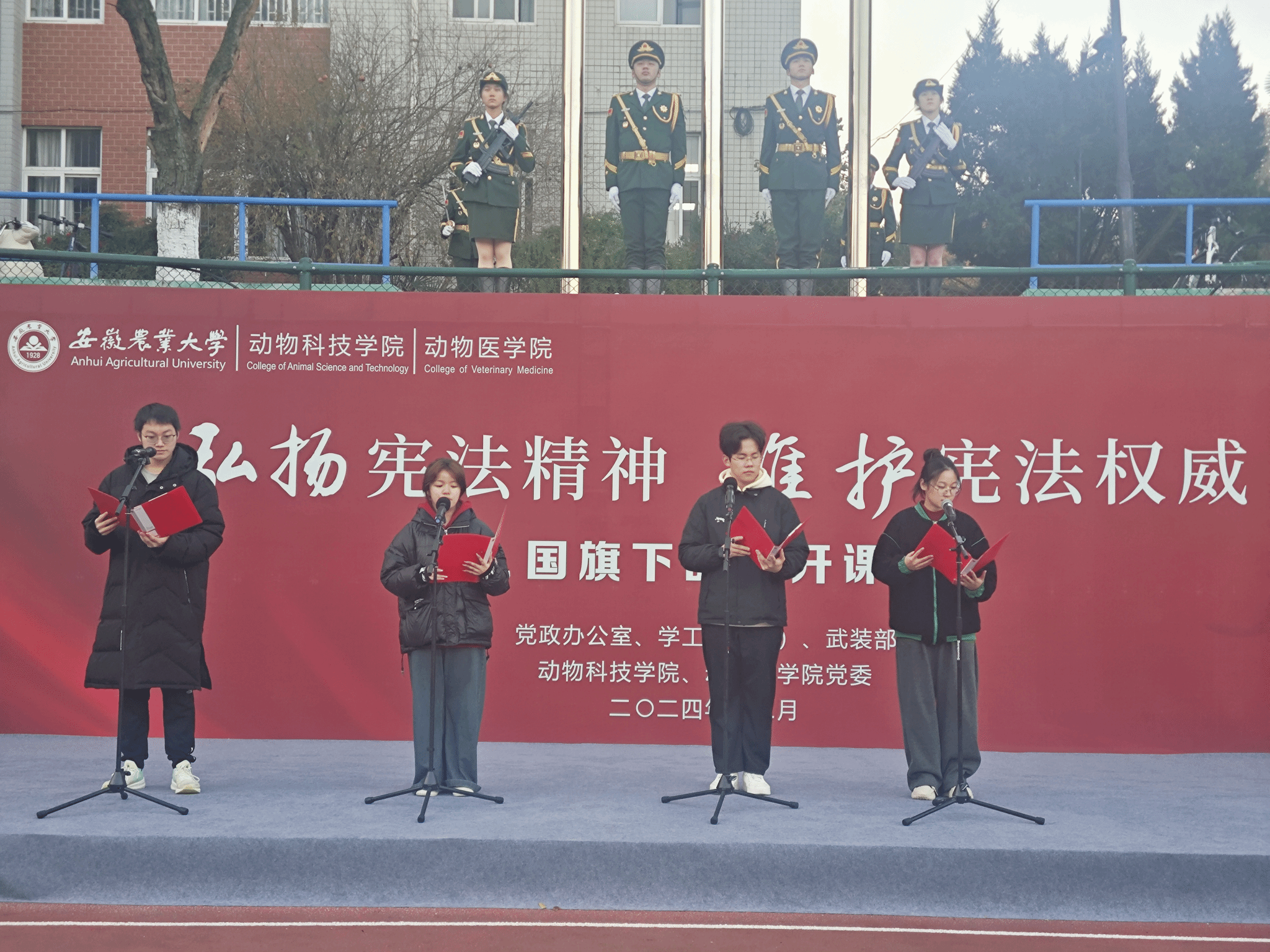 升旗仪式上,2022级动物科学专业张姮领读《宪法晨读内容》,在场全体师生共同学习和诵读宪法内容。2024级水产专业张思甜,24级动物科学专业黄思梦、陈瀚文、曹鹏,围绕《宪法在我心中》进行主题朗诵。作为新时代的青年,“我们”每个人都肩负着弘扬宪法精神的重要责任,要努力让“弘扬宪法精神 维护宪法权威”的信念在心中扎根,茁壮成长。