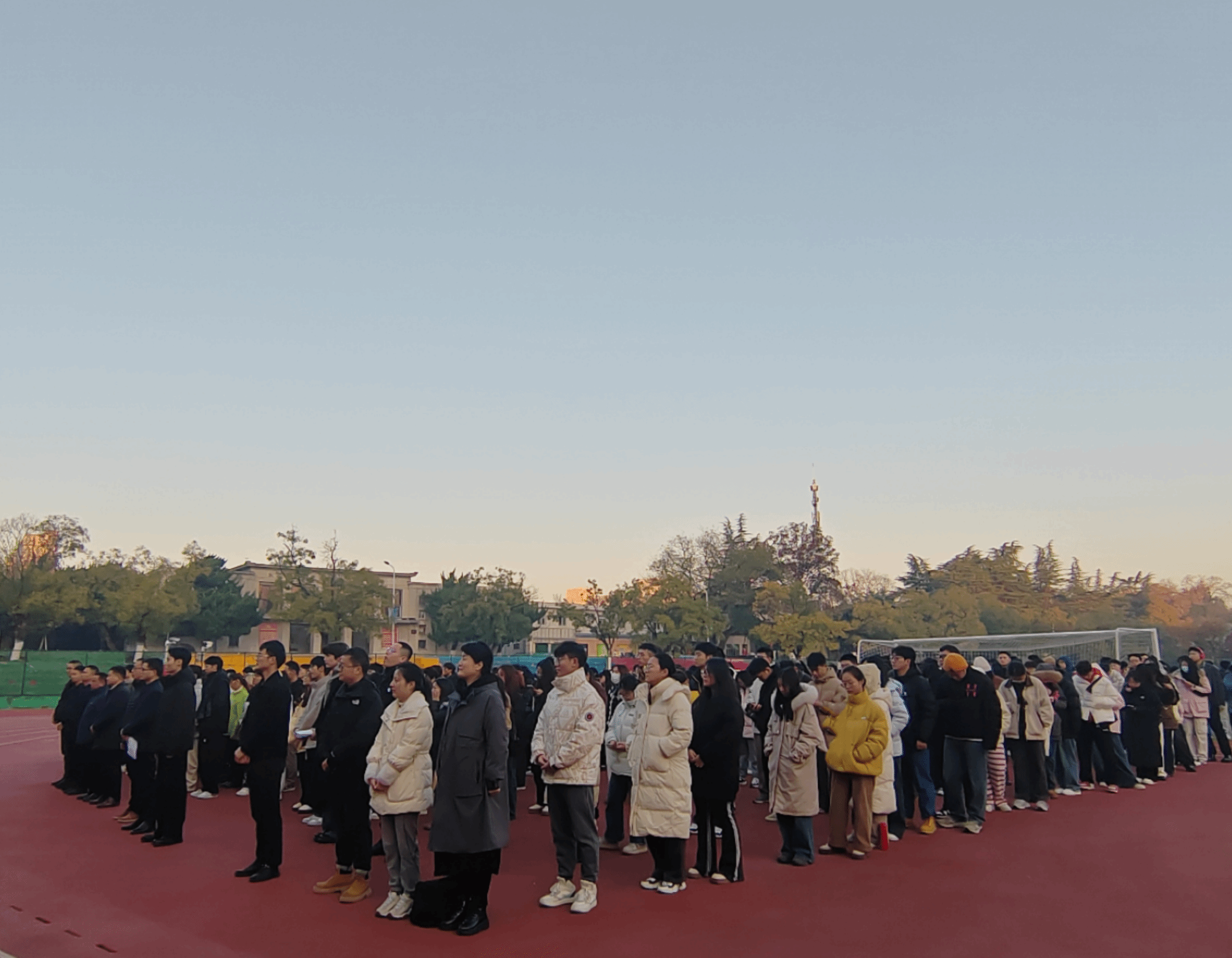 上午7时,国旗护卫队迈着整齐的步伐,护送鲜艳的五星红旗走向升旗台。全场师生肃立,面向国旗,奏唱国歌。在激昂的国歌声中,五星红旗冉冉升起,迎风飘扬。