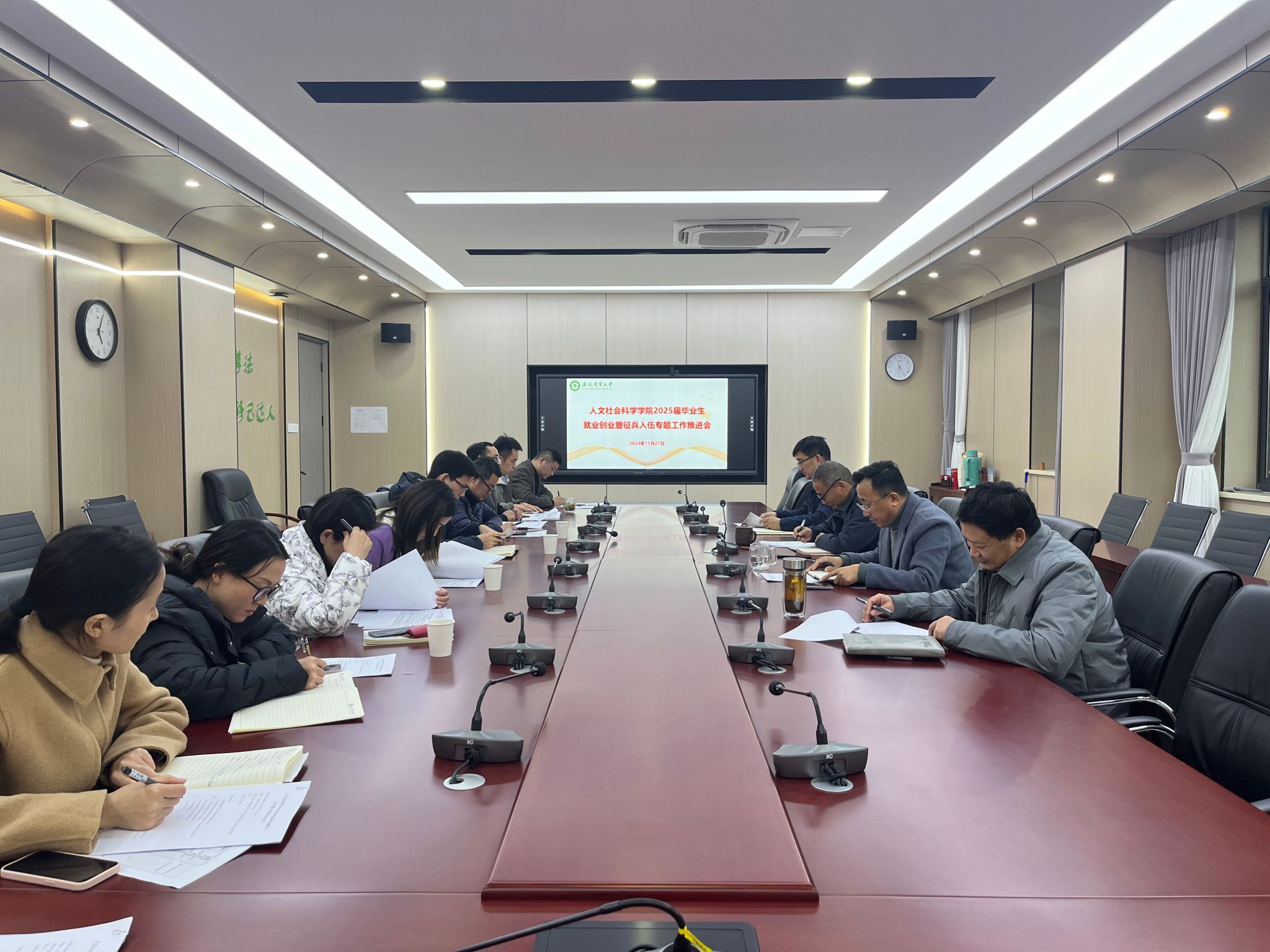 本网讯 为全面贯彻党的二十届三中全会精神和全国教育大会精神,落实教育部关于做好2025届全国普通高校毕业生就业创业工作的通知要求,推进学院毕业生高质量充分就业,11月27日,学院在人文楼206会议室召开2025届毕业生就业工作推进会。学院领导班子、各系主任、毕业班辅导员、就业联络员参加会议。会议由学院党委副书记孙辉主持。