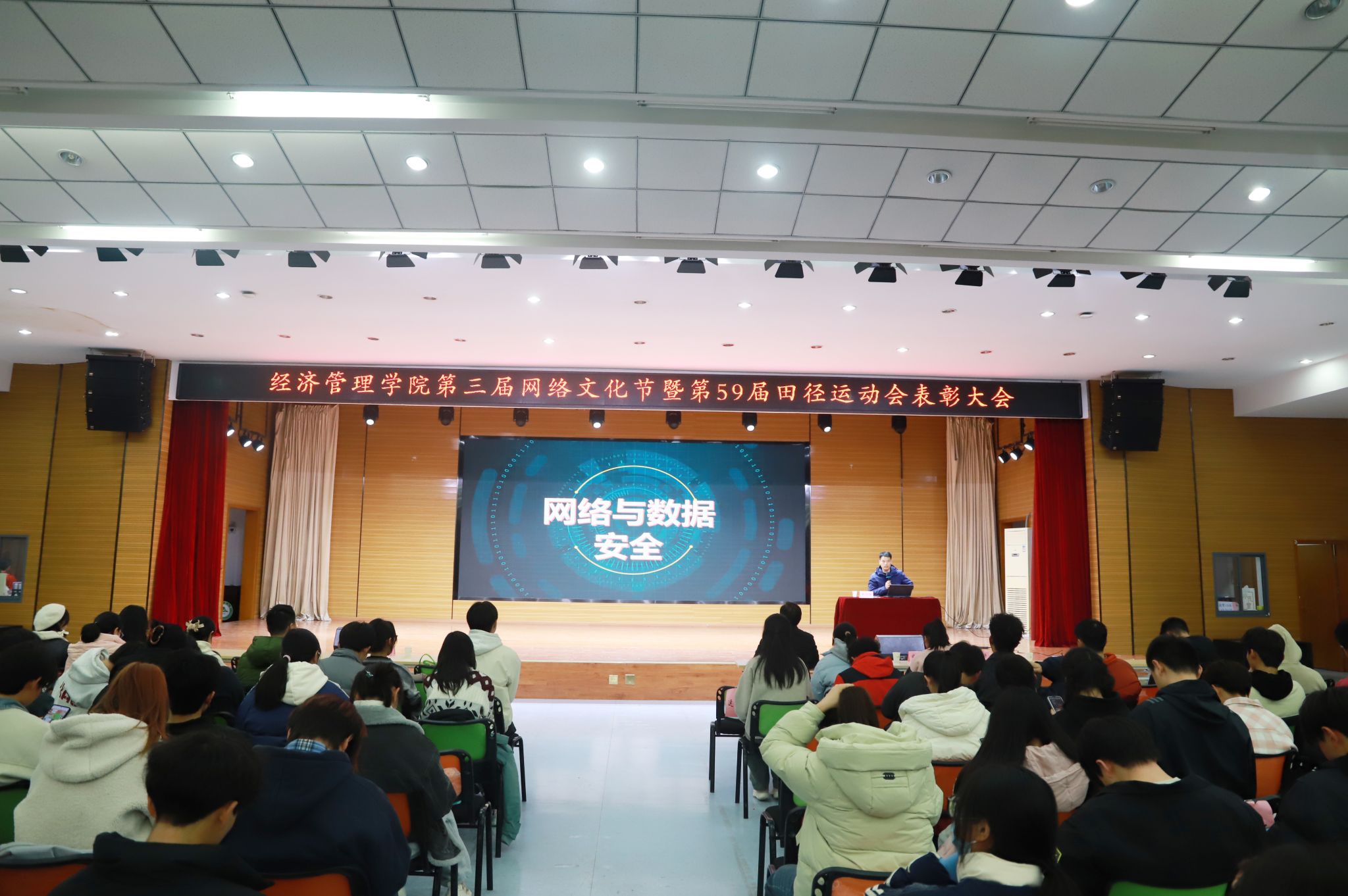 一段青春洋溢、热血澎湃的运动会回顾视频拉开了本次表彰大会的序幕。随后,出席本次活动的领导老师为经济管理学院学生田径名人堂成员、杰出运动员、优秀运动员、体育之星获得者75人,第三届网络文化节获奖学生48人以及学院网宣员队伍9人进行了颁奖。颁奖结束后,朱剑宇校友为全体参会人员作《网络和数据安全》专题讲座,他从频发的网络安全事件入手,向与会师生介绍了当前面临的网络安全风险,以及网络安全等级保护相关知识,为广大师生上了一堂精彩的网络安全教育课。