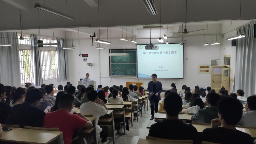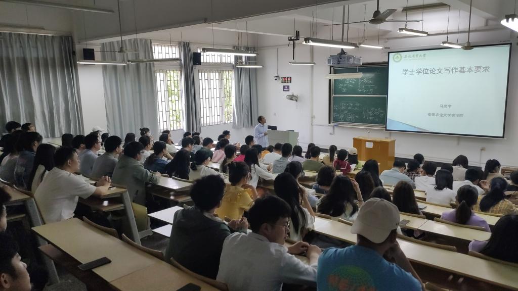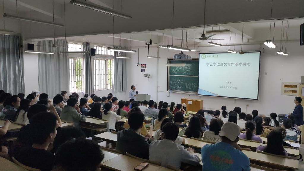 马尚宇老师结合安徽农业大学本科生毕业论文(设计)管理工作的暂行规定,对本科生论文写作目的、内容和基本要求做了详细讲解,本科生毕业论文要根据专业培养目标,结合科研、生产、实验等内容选题,在指导老师指导要求下完成。论文基本结构要包含前置部分:包括封面、开题报告和目录页等;主体部分:包括论文题目,作者及指导教师姓名,中文摘要,前言、正文、结论和参考文献,英文(外文)摘要,致谢等;本科学生毕业论文(设计)理科一般不少于6000字。附录部分:设计图纸、实验所用仪器、设备性能简介,照片和翻译论文、资料的原文、计算机程序等。评价:指导教师审阅意见、评阅人评阅意见和答辩委员会的结论性意见。主体部分基本格式也要按照学校要求规范整齐。马老师结合自己的省级教研项目和具体实例,耐心细致的为同学们讲解了本科生论文写作可能遇到的问题,并现场回答了学生的提问。