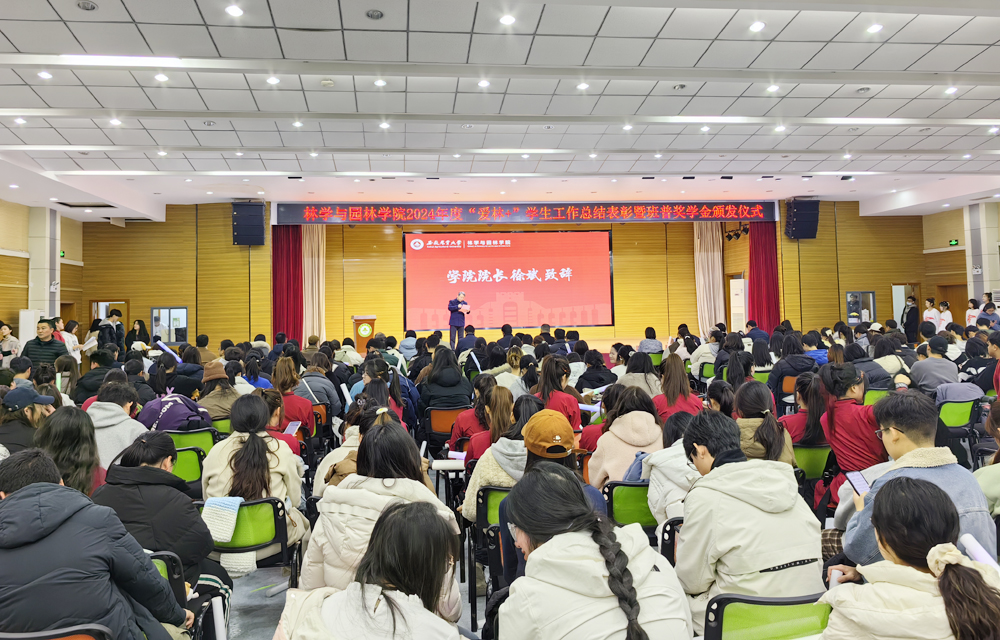 本网讯 12月16日下午,林学与园林学院“青春志承二十大,砥砺奋进谱芳华”2024年度“爱林+”学生工作总结表彰暨班普奖学金颁发仪式在欣苑四楼大学生活动中心举行。学院06届城乡规划专业优秀校友、班普设计公司总经理袁涛,校党政办、党委组织部、党委宣传部、教务处、党委研工部、党委学工部、校团委、体育部等单位负责人出席并颁奖,学院班子成员、各系部主任、师生代表共计400余人参会。
