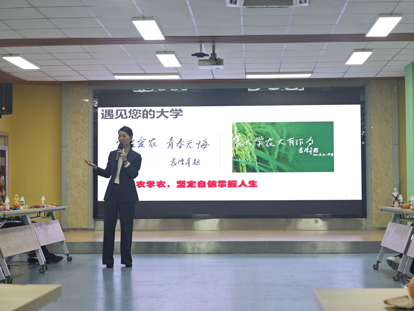 本网讯 为加强大学生思想政治教育,落实领导班子联系班级制度,了解学生所思所想所盼,进一步提高班级凝聚力和向心力,11月15日下午,园艺学院在欣苑三楼创客中心路演大厅召开大一新生主题班会,班级联系领导赵冠艳和班主任薛雍松出席,全体24级4、5班本科新生参加,班会由辅导员陆锐主持。