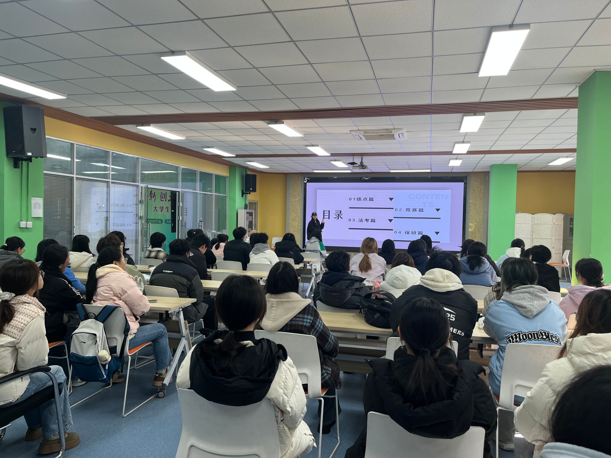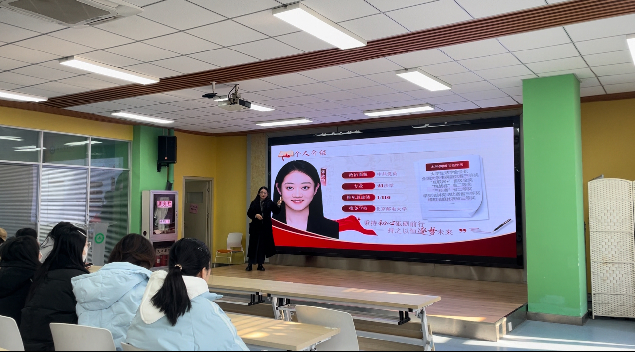 本网讯 为助力2024级新生养成良好的学习习惯,人文社会科学学院法学专业学生党支部于12月19日在路演大厅举办“传授经验,梦想接力”推免经验分享会。2024级法学专业70多位学生参加会议。