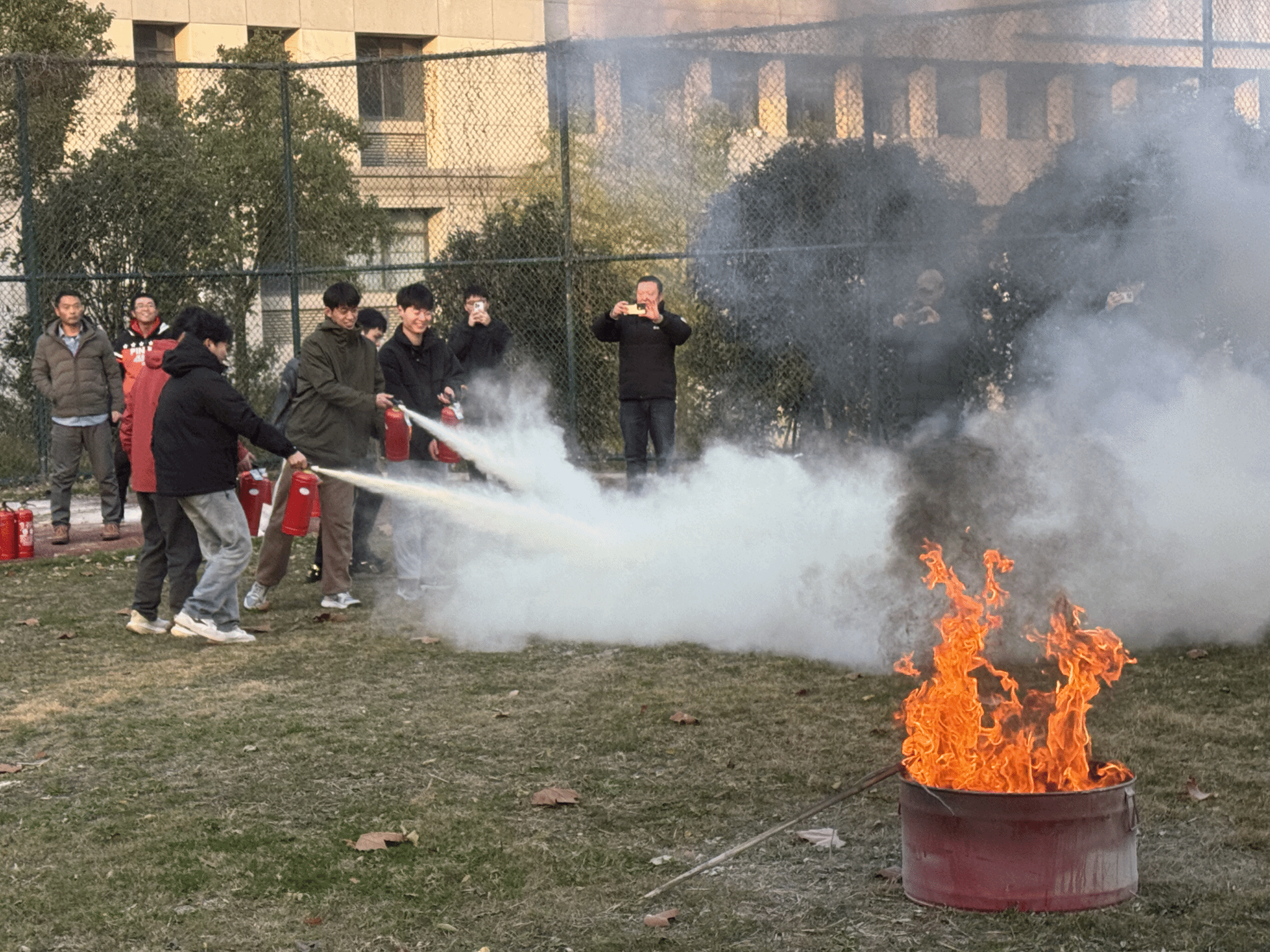 授课老师精心准备了讲稿和视频资料,重点介绍了实验室安全管理相关规章制度、仪器设备的操作规程、消防设备设施标识、灭火器与灭火毯的正确使用方法、我校实验室安全管理存在的问题与注意事项等内容,与会师生认真听讲,交流环节积极互动,大家的消防意识明显增强。会后,师生一行来到第四运动场参加消防演练,消防工作人员准备了明火模拟现场,参演师生按照指示要求,列队分组依次使用灭火器进行规范操作,站在火源的上风口1.5米处,手持灭火器对准起火点进行喷射灭火。
