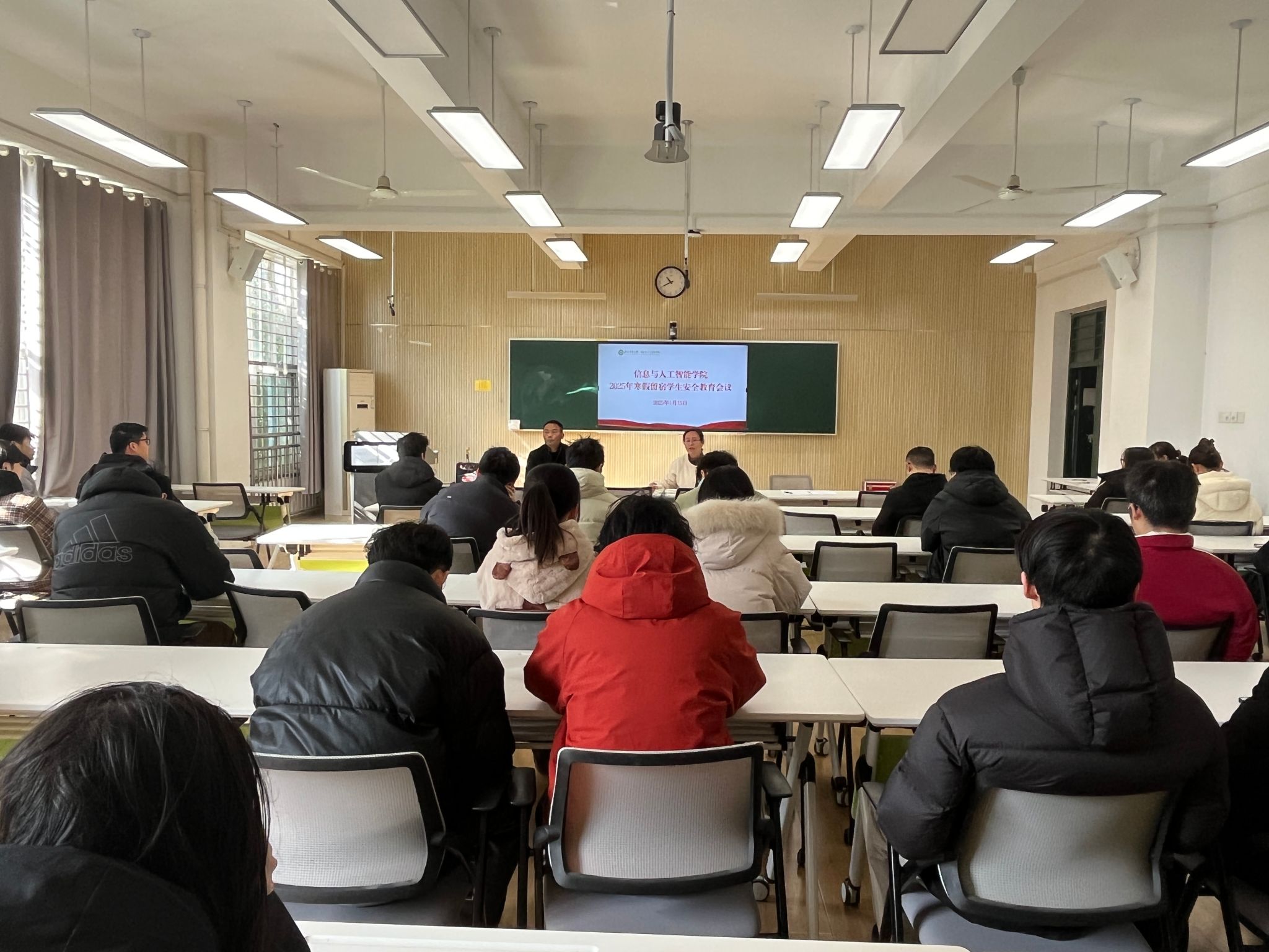 本网讯 1月15日,信息与人工智能学院在信智楼305会议室召开2025年寒假留宿学生安全管理工作会议。学院党委副书记、纪委书记李南飞、学院副院长吴永辉出席会议,本科生导师、辅导员和全体留宿生参加会议。