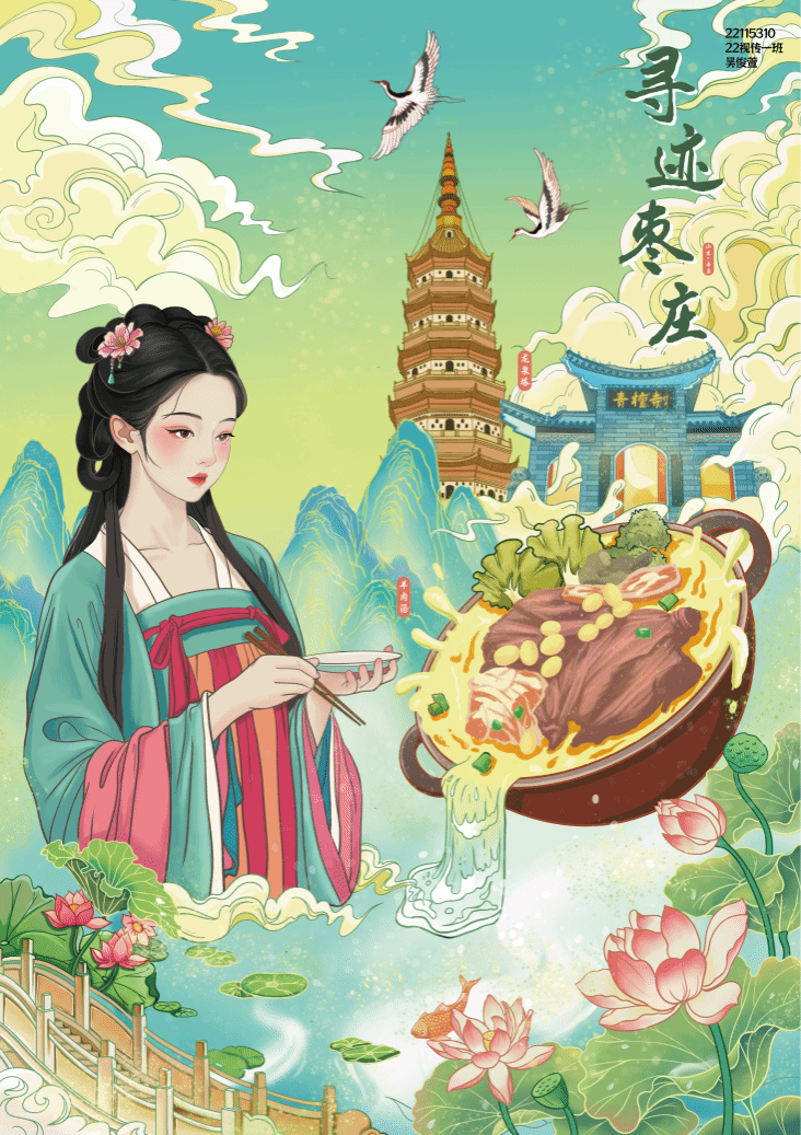 学院引导同学们以非遗保护与创新设计为切入点,将传统技艺与现代技术、环保理念相结合,赋予文化遗产时代生命力。在文化表达上,《清廉合肥》主题海报以包公祠为主体,融合徽派建筑元素与廉政格言书法,通过水墨渲染技法营造“清正廉明”的意境,实现传统文化符号与当代廉政教育的有机融合。在视觉叙事上,《寻迹枣庄》插画以黄绿色调串联龙泉塔、青檀寺等文化地标,通过手绘美食地图,为乡村文化传播注入年轻化表达。在传统工艺上,《浔埔簪花环保头冠》将泉州非遗簪花围技艺与可持续设计结合,采用环保材料编织基座,既保留传统美学精髓,又满足现代审美需求。在情感共鸣上,《衍纸里的中国梦》通过衍纸卷曲、叠压等技法,将爱国主义教育转化为可触摸、可参与的手工体验项目。