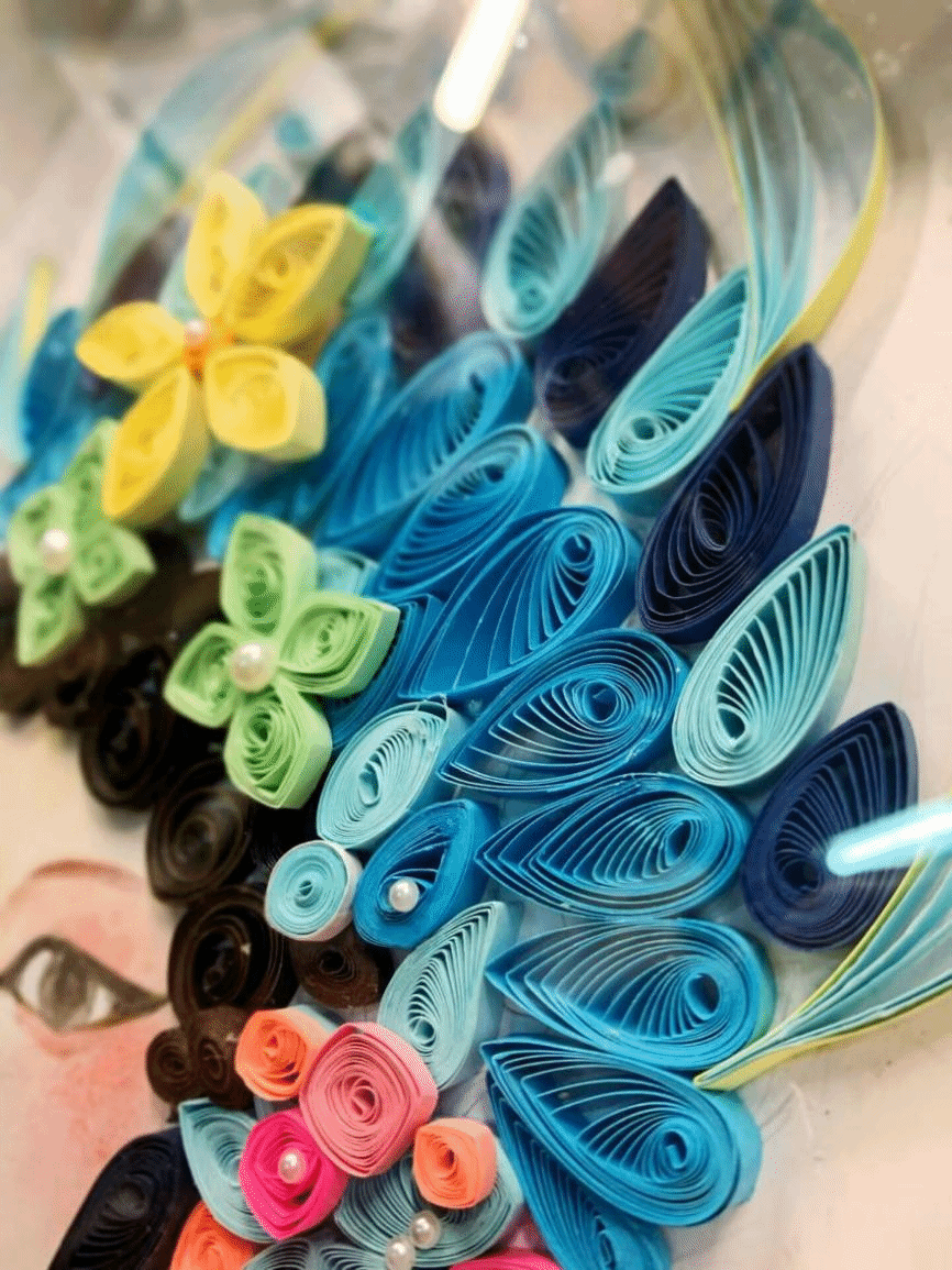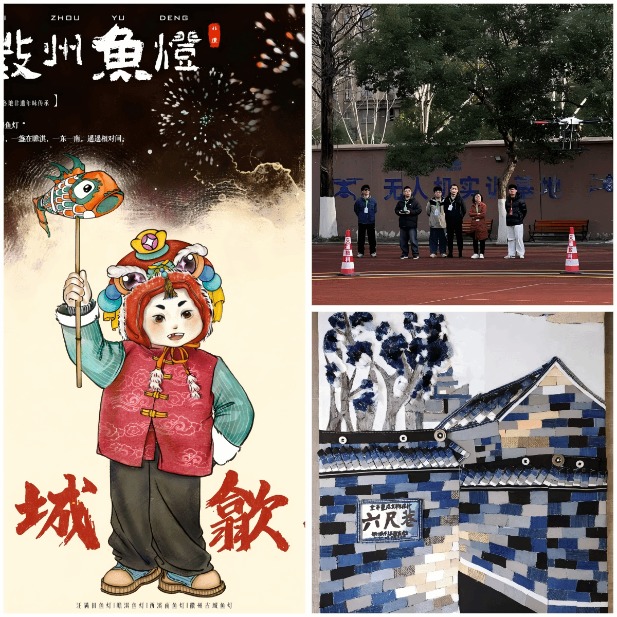学院倡导同学们在寒假生活中发现生活乐趣,通过介绍家乡年俗、风土人情,制作传统手工艺品、书画、年味食品等分享趣味时光。在传统文化上,通过数字绘画再现徽州鱼灯制作技艺,为乡村文旅产业开辟数字化传播路径。在科技赋能上,学生考取CAAC无人机执照,更为乡村文化遗产的数字化存档提供了新思路。在艺术创新上,采用废旧牛仔布拼贴技法,以深浅布料肌理再现桐城六尺巷的建筑风貌,作品将“环保再生”理念融入传统礼让文化,实现物质循环与精神传承的双重价值。在文创实践上,将国家级非遗黄梅戏《天仙配》经典场景转化为衍纸艺术作品,探索非遗IP市场化转化的可能性。