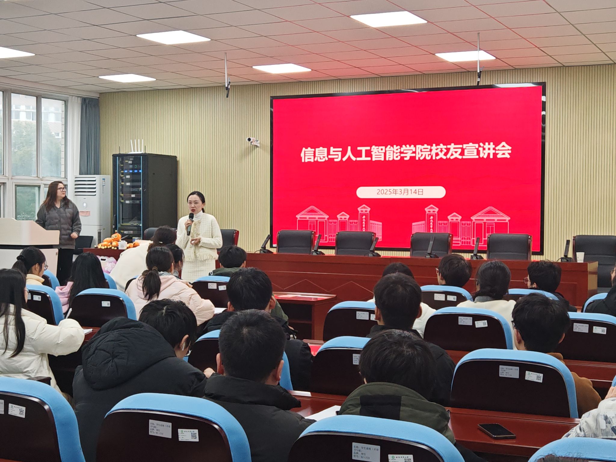 本网讯 为加强校友与学校的沟通,充分发挥校友在帮助学生树立正确择业观和就业观中的作用,3月14日,合肥铁榔头教育科技有限公司部分校友受邀在信智楼202教室开展校友报告会。学院党委副书记,纪委书记李南飞、合肥铁榔头教育科技有限公司组织发展部负责人韦燕参会,2024届智能科学与技术专业校友宛驰山、孔嘉慧面向学弟学妹报告了毕业一年来的成长与收获。