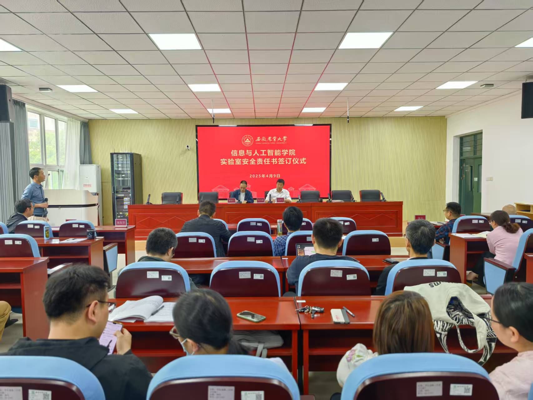 本网讯 4月9日,信息与人工智能学院在经技楼202会议室举行实验室安全责任书签订仪式。学院党政领导班子、实验平台主任及全体教职工出席会议,仪式由副院长吴永辉主持。