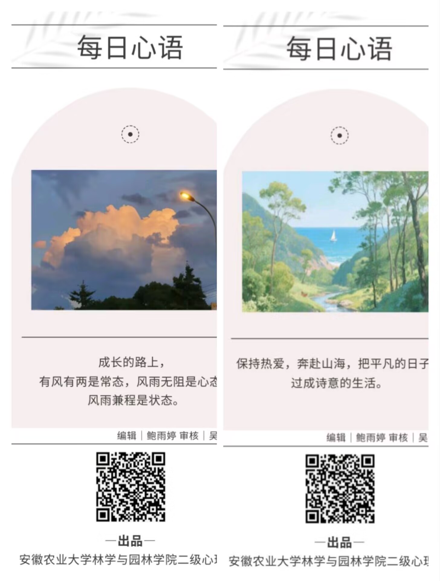 “每日拾光,心语润田”每日心语推动活动。除了线下活动,学院二级心理工作站还通过线上平台开展了每日心语推送活动。每天一条充满温暖与力量的心灵寄语准时推送到同学们的手机上,截止目前已推出149期。这些心语或蕴含哲理,或充满鼓励,或分享心理健康小知识,活动以润物细无声的方式,陪伴同学们度过每一天,为他们带来心灵的慰藉和鼓舞,成为同学们日常生活中的一抹温暖亮色。