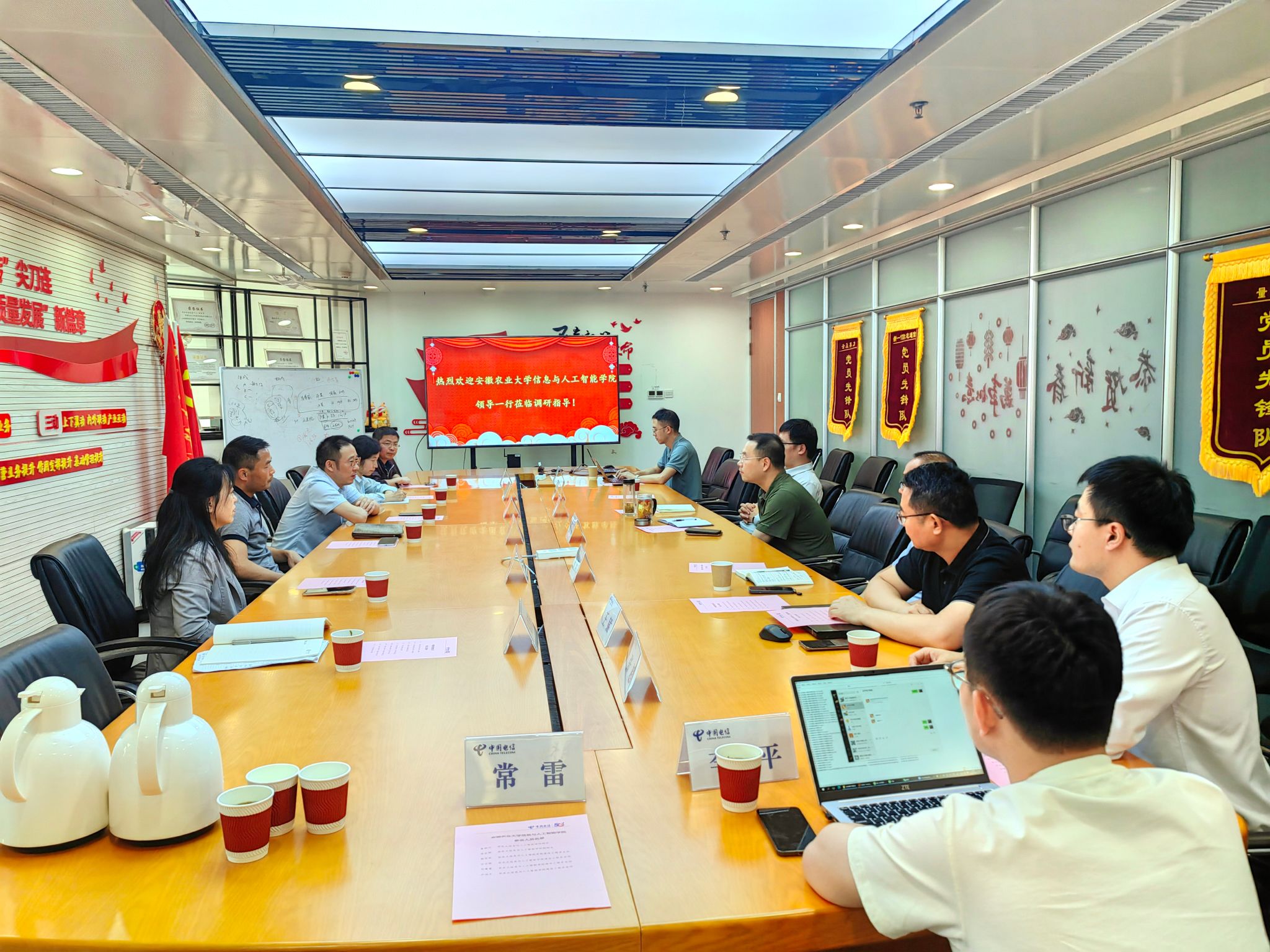 本网讯 5月13日,信息与人工智能学院院长辜丽川、副院长吴永辉率通信工程系骨干教师一行,赴中国电信安徽公司开展访企拓岗。中国电信安徽公司战新产品运营中心总经理洪飞、副总经理张琳、政企部教育BU总监陈跃等接待学院一行,并组织召开专题座谈会。