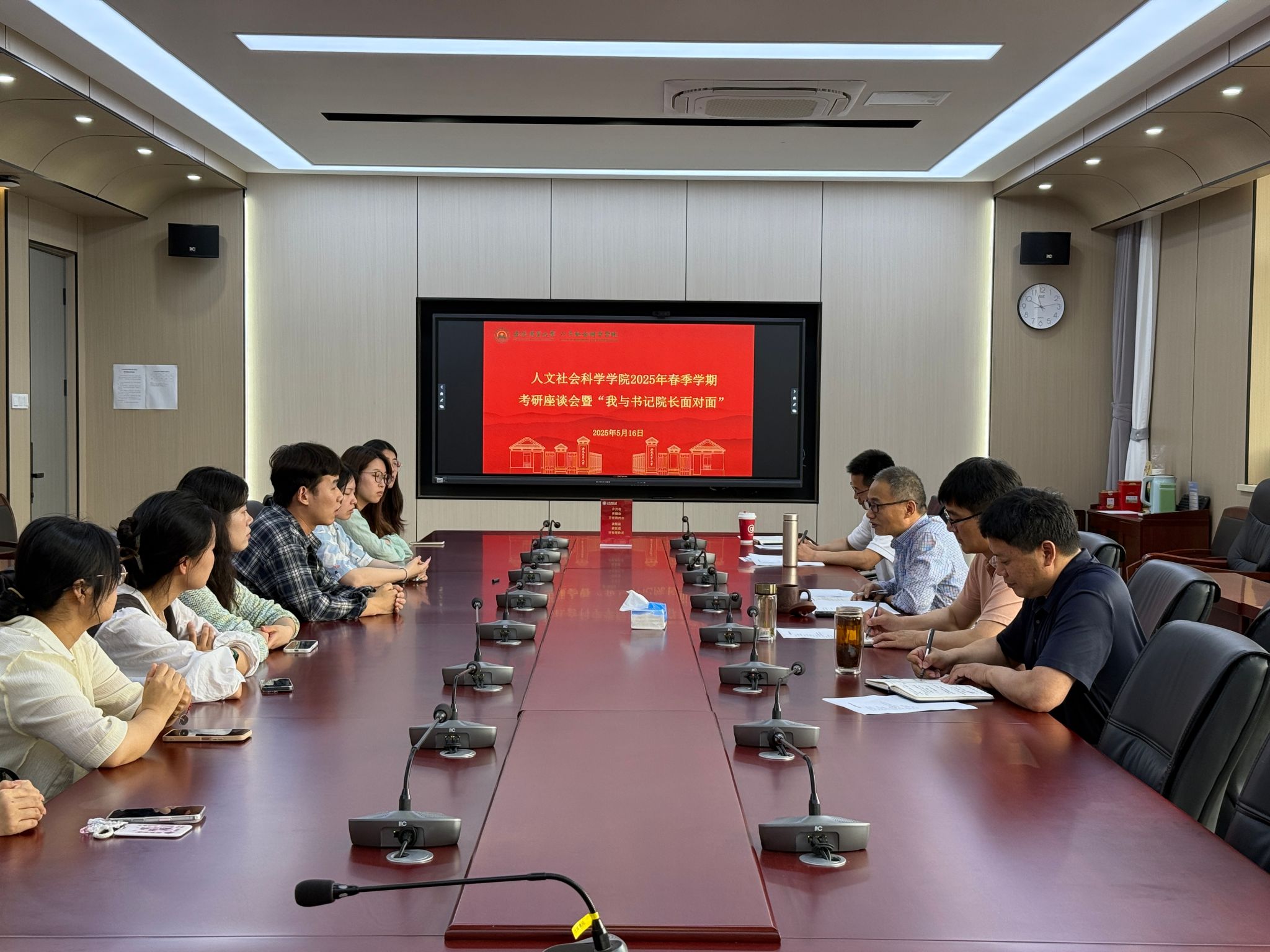 本网讯 为进一步加强学风建设,倾听学生心声。5月16日上午,学院在人文楼206会议室举办考研座谈会暨“我与书记院长面对面”活动。学院党委书记王冬平、党委副书记孙辉、副院长滕瀚、毕业班辅导员及2025届毕业生代表参加会议。