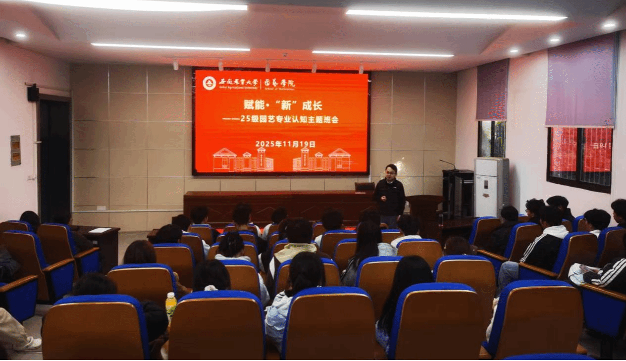 本网讯 为深入落实“六联系”制度,增强新生的专业认同与学习动力,持续推进学风建设,11月19日下午,我院2025级园艺1班、2班召开主题班会,邀请学院副院长、国家高层次人才殷学仁教授,与新生们开展了一场园艺专业认知的面对面交流,会议由班级辅导员、院党委副书记叶辉主持。