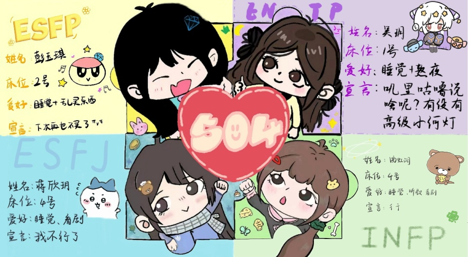 活动中,各寝室充分发挥想象力与动手能力,X10#304寝室的悬挂式翻转装饰板,集手绘卡通、干花、日常标签与加油打气字样于一体,细节满满,充满治愈感;G10#504寝室以MBTI人格测试为主题,手绘海报搭配个性宣言,生动展现寝室成员的多样性格与融洽氛围。