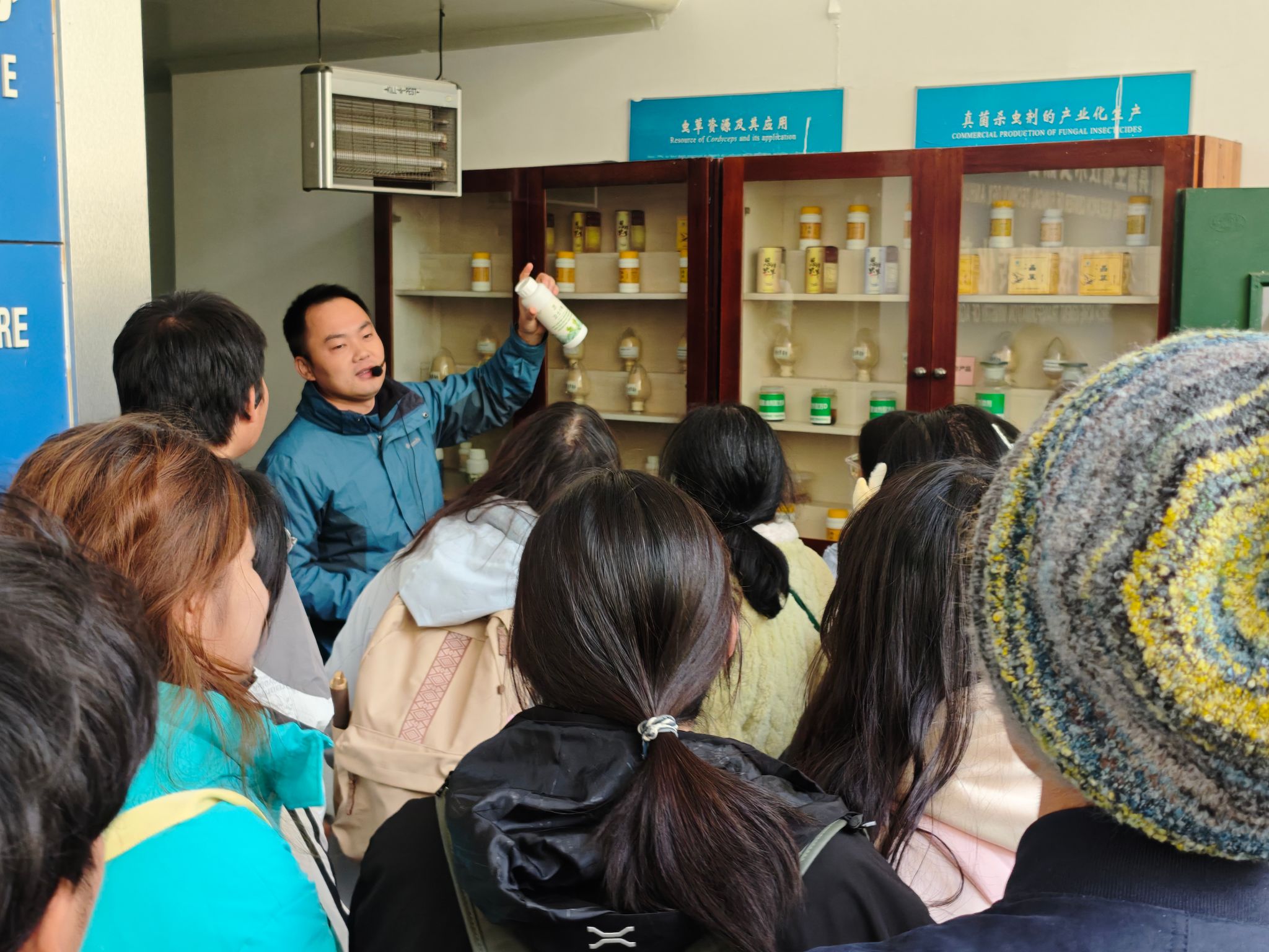 在真菌生物技术教育部工程研究中心,王玉龙老师为同学们讲解了真菌现代化生产流程,展示了丰富的虫草资源及其在医药、保健等领域的广泛应用,详细介绍了真菌杀虫剂从研发到产业化生产的全过程。同学们对精密仪器和神奇的真菌世界展示出浓厚的兴趣。