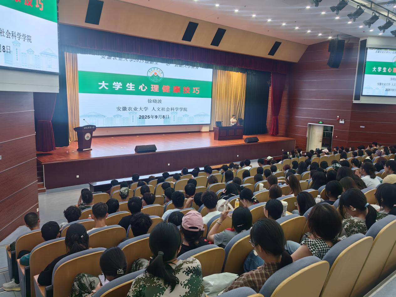 本网讯“芯”程相伴启新程,润心赋能育新人。9月8日晚,安徽农业大学2025级本科生“‘芯’启航”入学教育系列课程第六讲“大学生心理健康技巧”在图书馆第一报告厅正式开讲。2025级全体新生通过“主课堂+分课堂”形式同步参与,沉浸式体验了一堂别开生面的心理健康“必修课”。本次课程由学校人文社会科学学院徐晓波副教授主讲,该院党委书记王冬平主持。